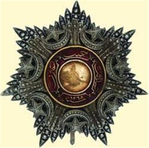 Grand Cross Breast Star; breast star, silver brilliant cut, medallion gold resp. gilt and partially enamelled, strong crescents and stars on obverse; official mark, Turkish hallmarks (also on obverse) and zigzag line on reverse, with thin pin and two side hooks. Fine old quality with small enamel restoration, signs of cleaning and polishing.