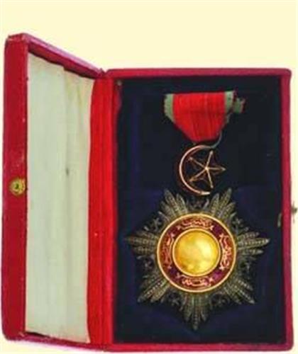 Knight's Decoration (5th class); breast badge, silver brilliant cut, medallion gold partially enamelled, with enamelled crescent and star (gold) above and suspension ring and piece of old original ribbon; old flat version with old (European) box. Very fine old quality from about 1860 with small signs of age!