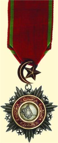 Knight's Decoration (5th class); breast badge, silver brilliant cut, medallion gold resp. gilt and partially enamelled, with enamelled gold crescent and star with suspension ring with original ribbon. Early version from mid-19th-century in smaller size (diam.: ca. 49 mm), tiny enamel damages, signs of polishing (centre).