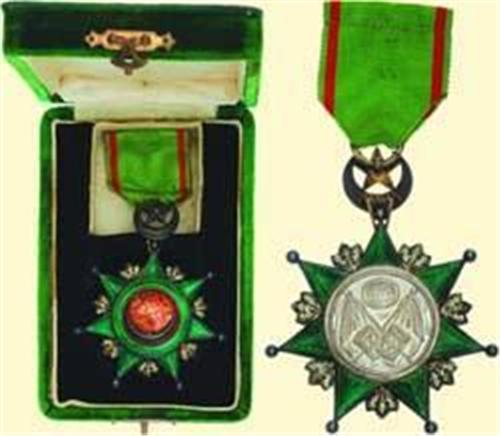 Knight's Decoration (5th class); breast badge, silver, both sides partially enamelled, obverse medallion with gold onlay, crescent and star above, with suspension ring and original ribbon; in original green velvet box of issue with gold imprint. Very fine old quality in near best condition, some patina!