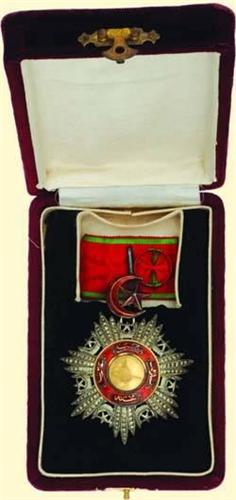 Officer's Decoration (4th class); breast badge, silver brilliant cut, medallion gold resp. gilt and partially enamelled, with enamelled crescent and star suspension loop (with thin gold onlay) and original piece of ribbon with rosette; with official mark, Turkish hallmarks and zigzag line; in original red velvet box of issue with gold imprint. Small signs of age, very attractive!