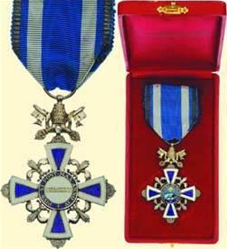 Knight's Cross - Bene Merenti; breast badge, silver, both sides enamelled, with Papal symbol above, illegible mark on suspension ring; with original ribbon, in original box of issue ("J.M.Lorioli...Milano"). Very fine quality and very attractive