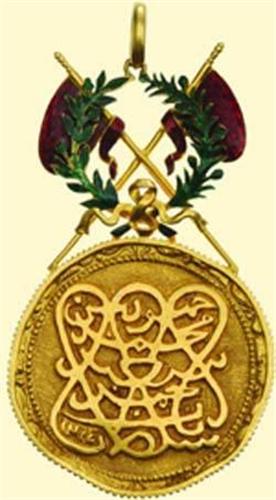 Breast badge, gold, medal with crossed red enamelled flags and green enamelled wreath above, multipart construction, size 32,8 x 56,0 mm, weight 13,0 gramme; cast medal with cypher of Sultan Bargash Ben Said of Zanzibar on obverse, reverse is an incusum from last third of 19th century; with original small suspension loop. Excellent old quality of high attractivity, very rare! Tiny enamel damage on green wreath!