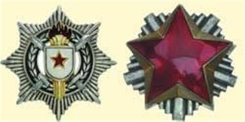 Order of Military Merit, Badge 3rd class, breast badge, silver, torches and central star gilt and partially enamelled, tapered pin on reverse, Yugoslavian hallmarks and maker's mark. Army Cockade for officers, bronze enamelled, with metal grey background, screw on reverse ("IKOM ZAGREB"). Very fine qualities and conditions!