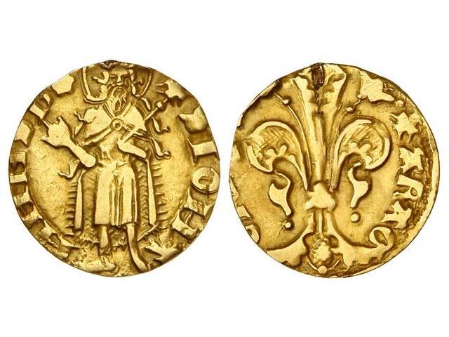 MEDIEVAL COINS: CATALONIA-ARAGÓN - Florí. PERE III. BARCELONA. Anv.: S IOHA-NNES B. Marca: rosa. Rev.: ARAG-(OREX.P). 3,30 grs. AU. (Descolgada). Cru.VS-389. MBC+.
