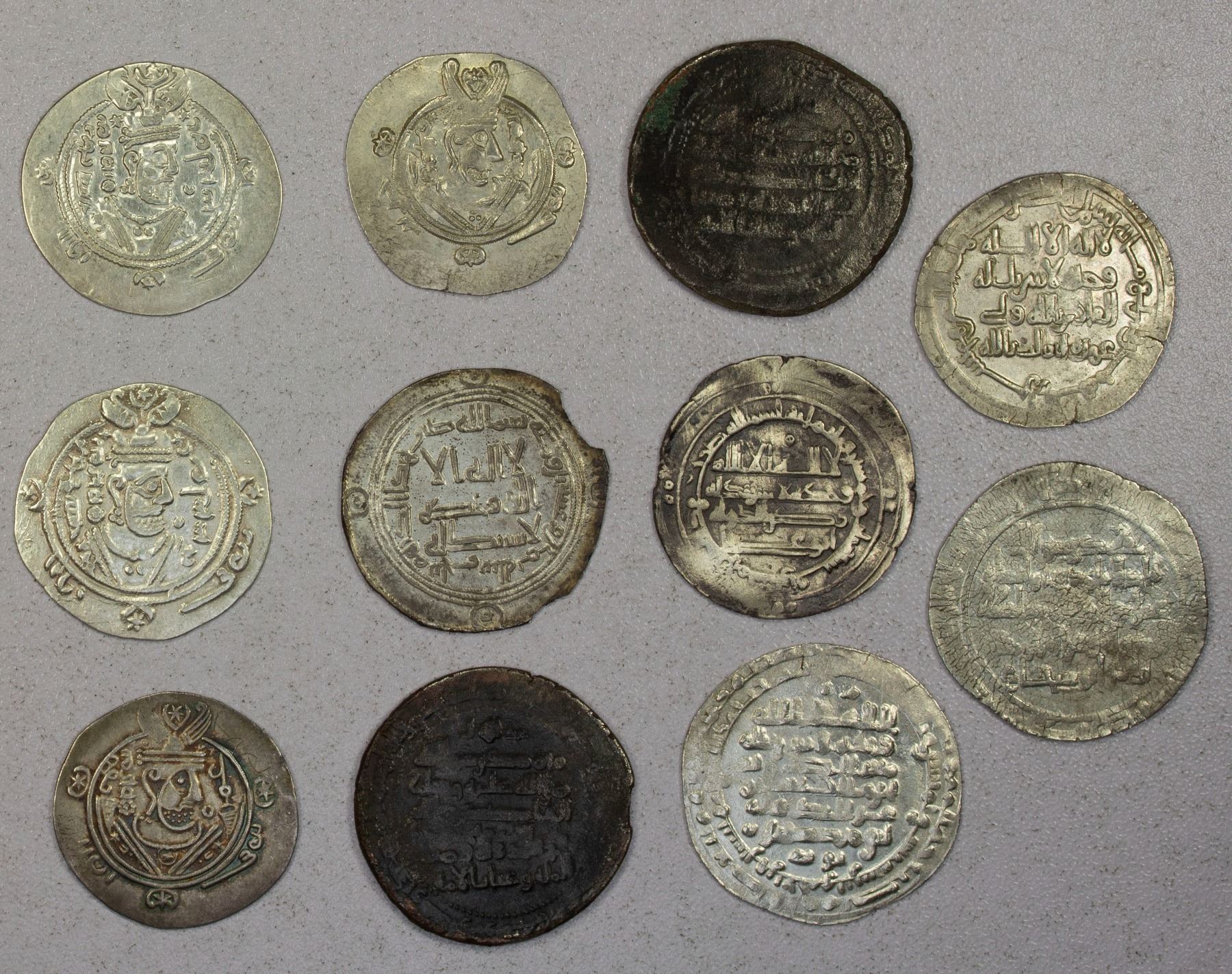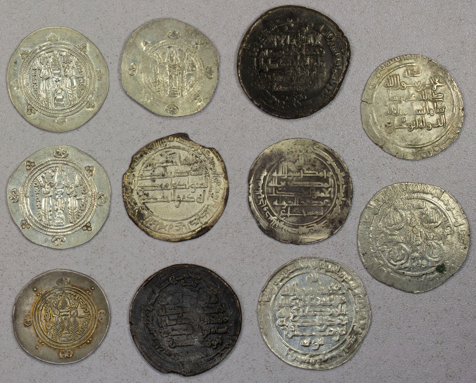MEDIEVAL ISLAMIC: LOT of 11 silver coins, Tabaristan (4 pcs, two of Farkhan, one each of Umar and Jarir, average VF or better); Umayyad (1, Balkh AH128, harsh porosity and one chip); and Buwayhid (6, Siraf 353, Shiraz 394, Shiraz 39x, Shiraz 408, Tustar min al-Ahwaz 356, and Shiraz 4xx); average circulted grades, a few nicer; retail value $475, lot of 11 pieces.