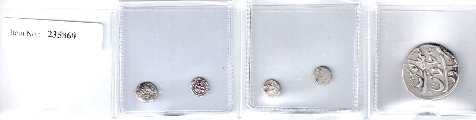 MEDIEVAL ISLAMIC: LOT of 4 tiny silver coins and 1 Mughal rupee: Kalachuri: Kalahasila, ca. 600, damma, head right // 3-line text, of which sri / ka la is partially legible (VF); Saffarid: A-A1403.2, Ahmad b. Muhammad, 1/10 dirham, mint & date off (VG-F); Fatimid of Multan: A-A702, damma, citing Ma'add, so probably an issue of the Imam al-Mu'izz (VG), and one uncertain type, styl of al-Mu'izz (Fine, much flatness); and Mughal: KM-436.50, rupee, Peshawar AH1136 year 6 (VF, cleaned); retail value $325, lot of 5 pieces.