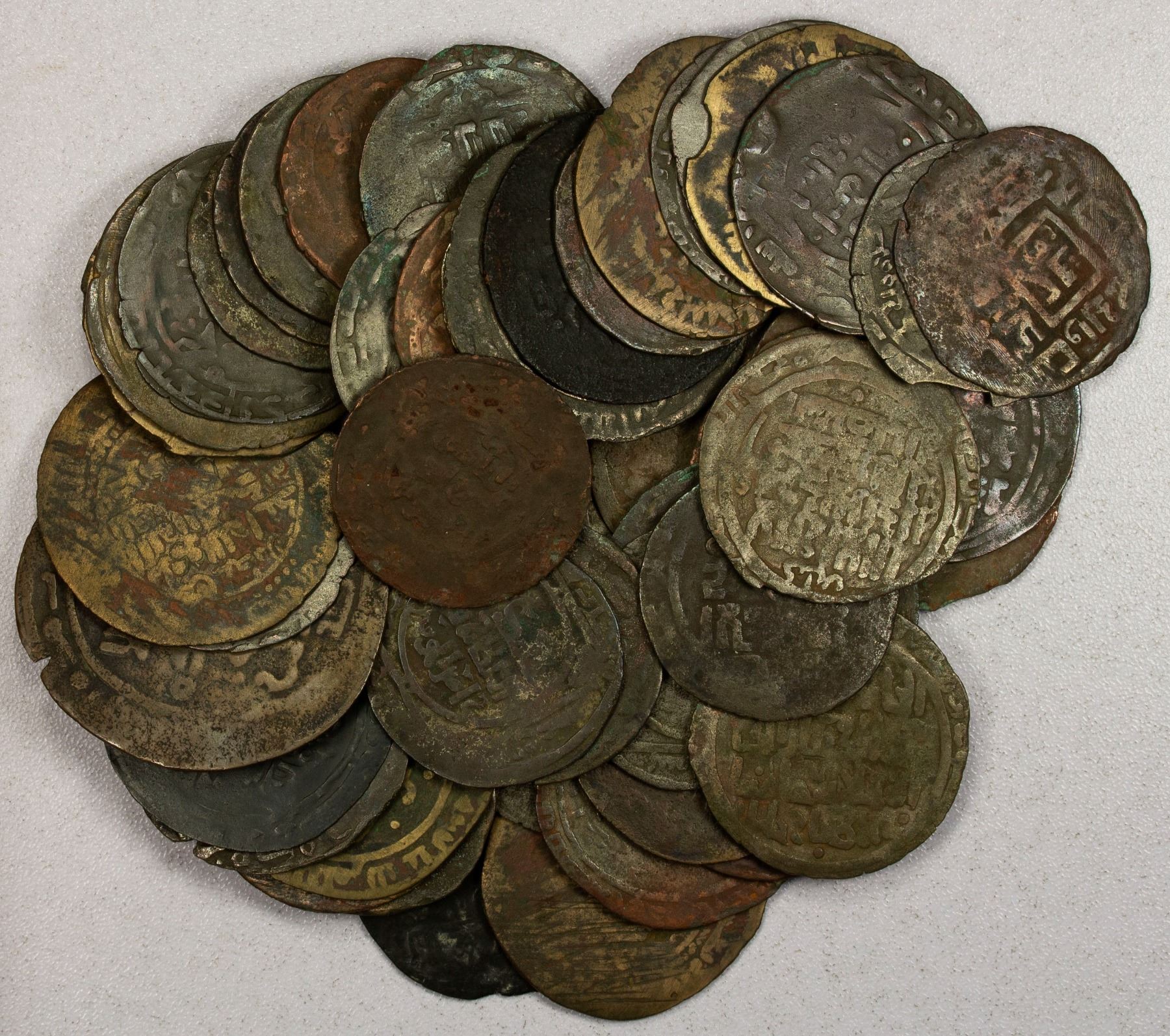 MEDIEVAL ISLAMIC: LOT of 55 broad thin copper fulus, unidentified, but including many from the Khwarizmshah Muhammad b. Takash, many late Qarakhanid (mostly Samarqand types), a few Great Mongol anonymous issues, and 7 from the mint of Bust (two of the Amirs of Bust, the rest probably all Ghaznavid issues of Mahmud); average Good to Fine condition, but all with flatness, weakness, adhesions, or other defects, probably at least half can be identified; retail value $550, lot of 55 pieces.