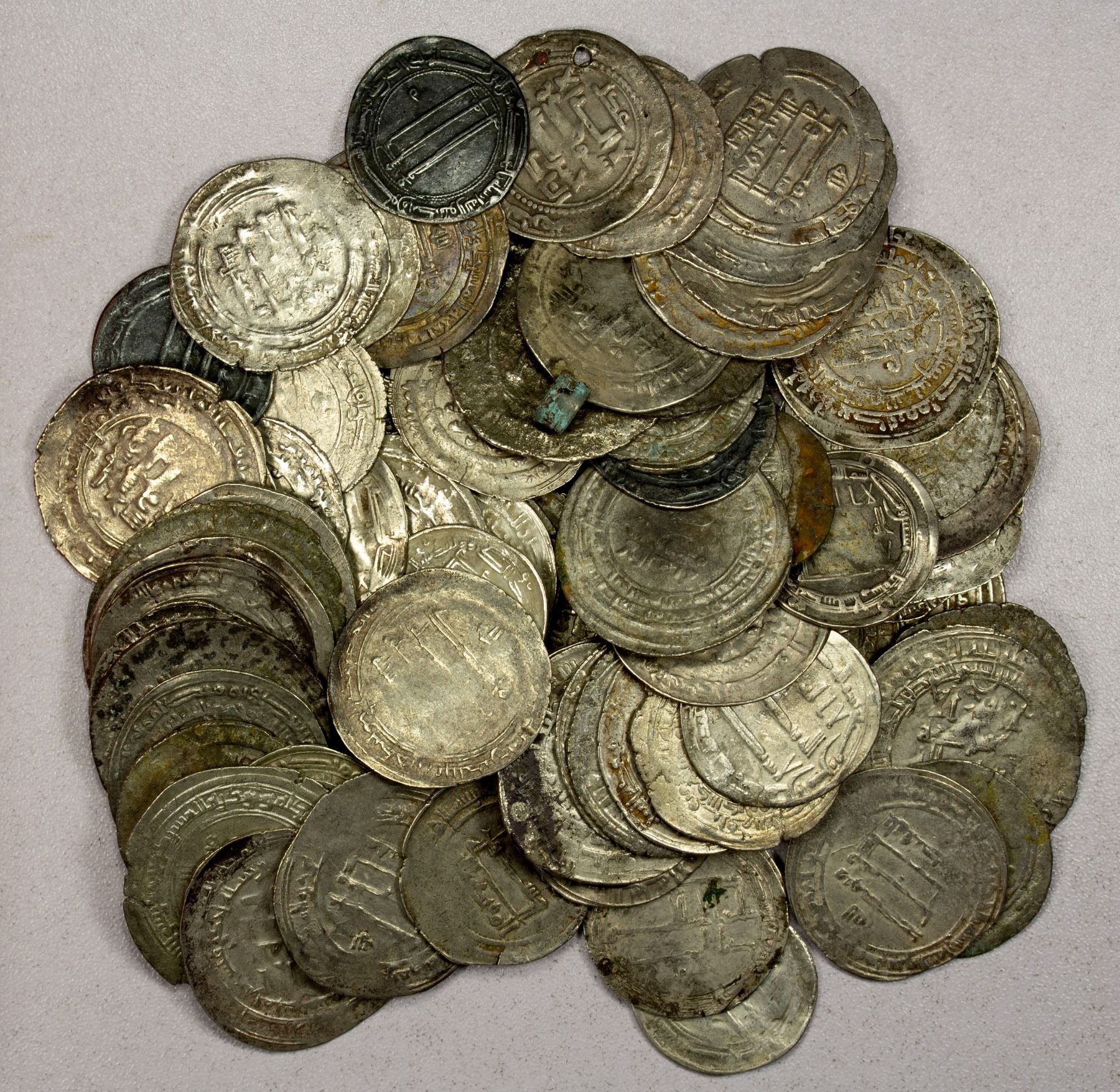MEDIEVAL ISLAMIC: LOT of 85 silver coins, various early dinasties: Abbasid: mints of Fars, al-Muhammadiya, Balkh, Isfahan, al-Ahwaz, Madinat all-Salam, Shiraz, al-Shash, Hamadan, al-Rafiqa, and Suq al-Ahwaz; Saffarid: Fars & Arrajan; Samanid: al-Shash; Buwayhid: Arrajan, Fasâ, Isbahan, Sariya, and Shiraz; and Qarakhanid: Samarqand; average Fine to VF condition, but most with various defects, such as flat areas, corrosion, adhesions, weakness, etc.; unattributed and loose in a box; retail value $1400, lot of 85 pieces.