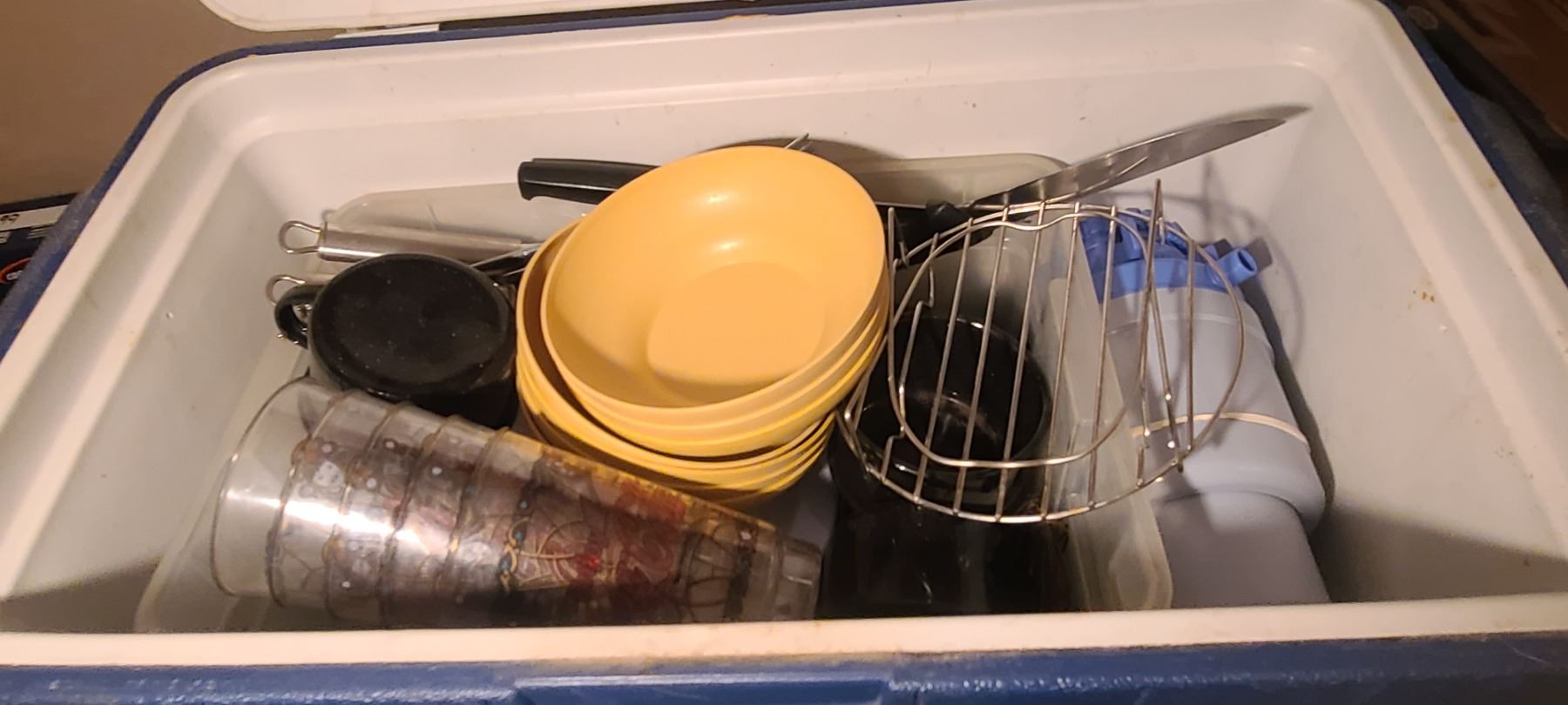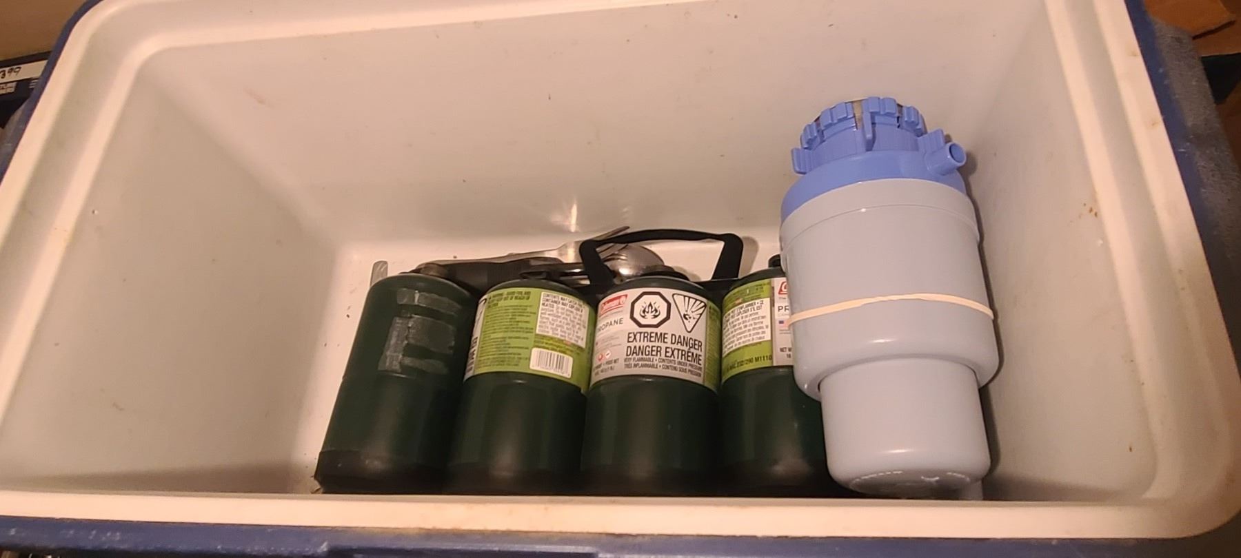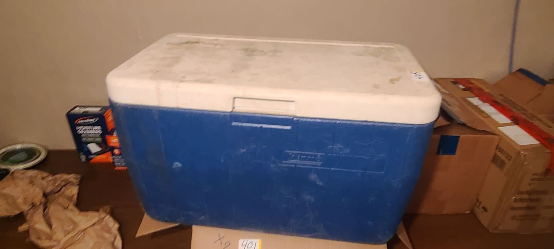 MEDIUM COLEMAN COOLER C/W WITH PROPANE BOTTLES AND CAMPING SUPPLIES