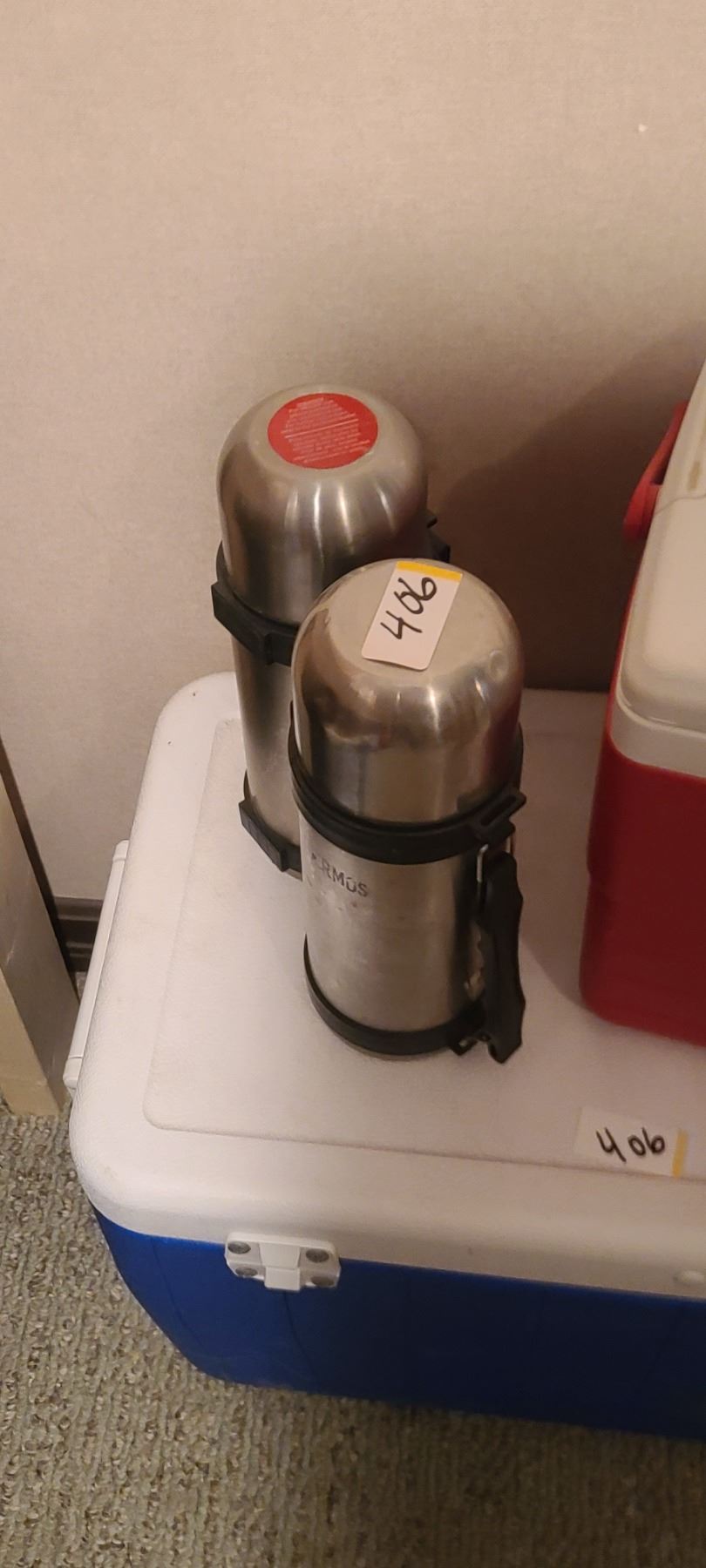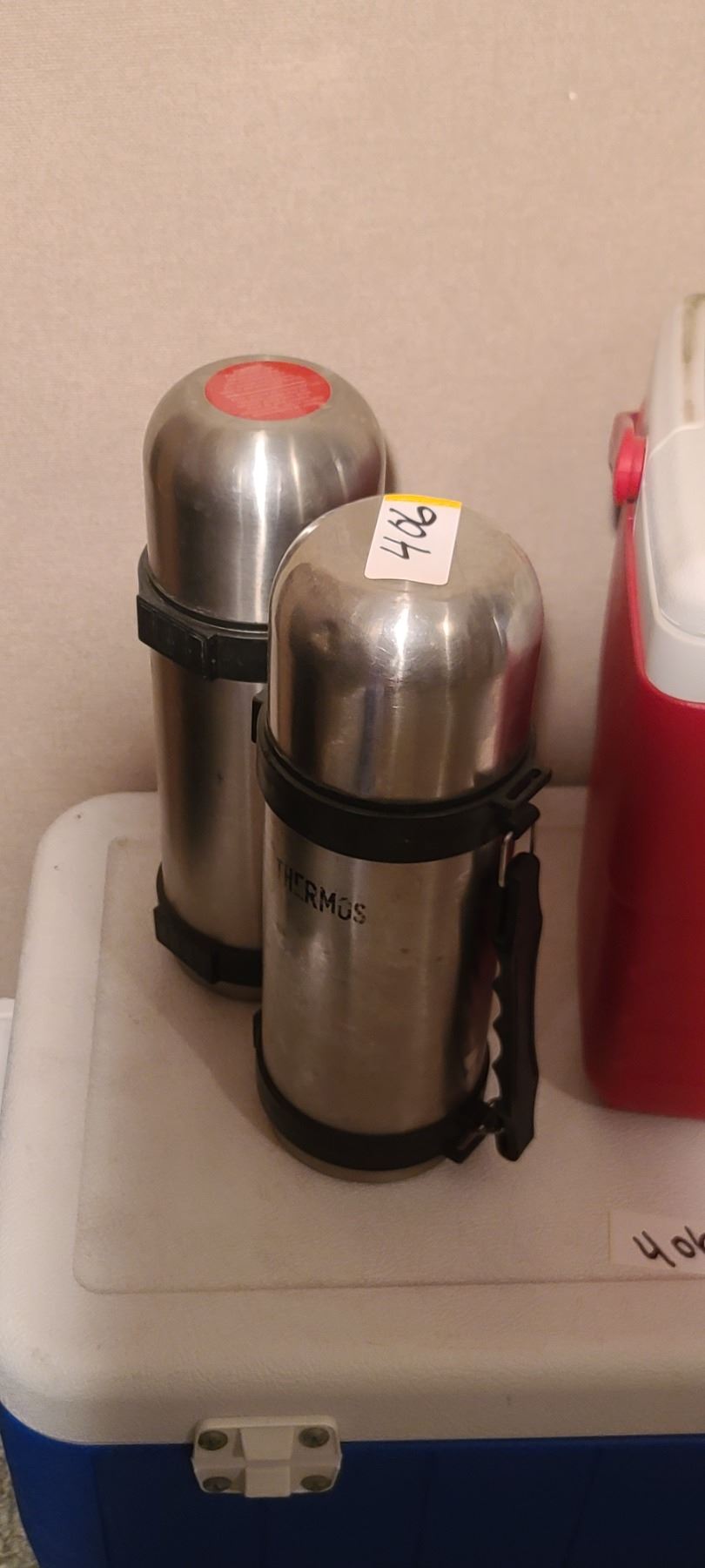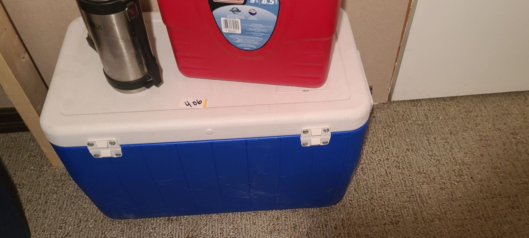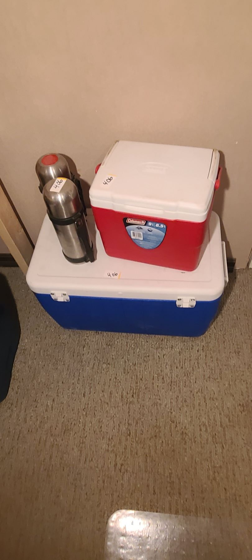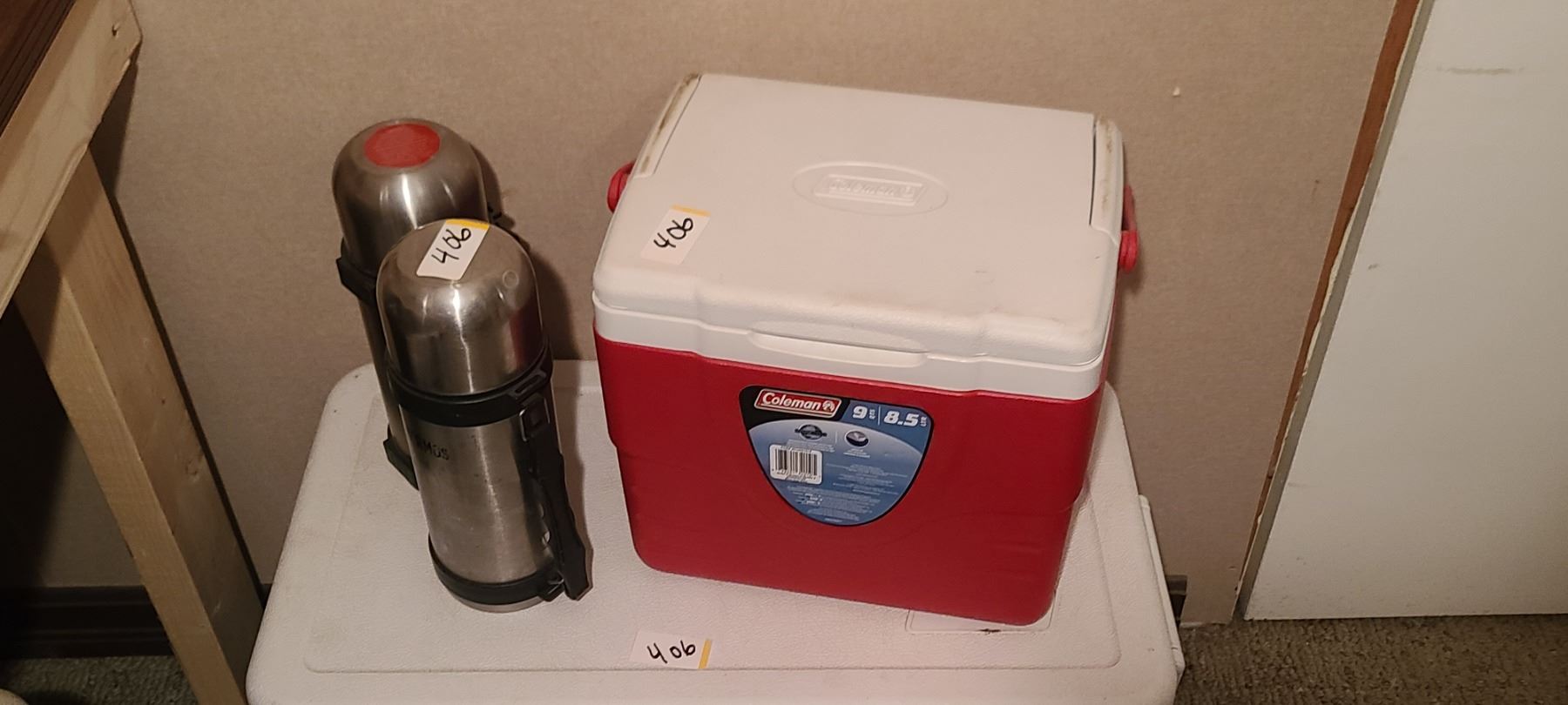 MEDIUM COOLER, SMALL COOLER AND 3 THERMOS BOTTLES