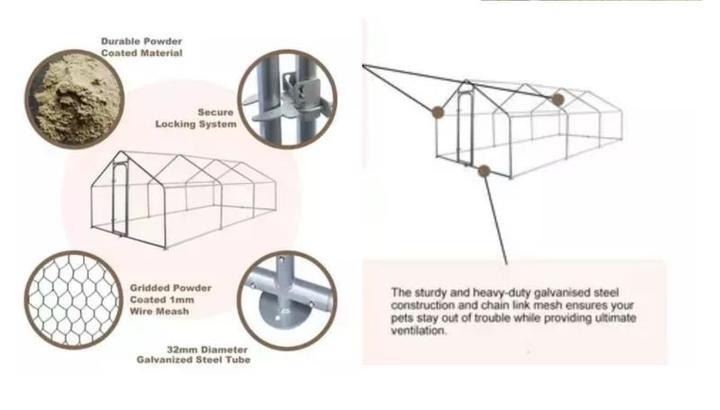 COVER IN BOX: UN-ASSEMBLED GALVANIZED METAL CHICKEN COOP, GALVANIZED DOOR WITH LOCK, WIRE MESH FOR FULLY ENCLOSED ROOF AND SIDES, WATERPROOF ROOF COVER, ASSEMBLY INSTRUCTIONS. MATERIAL: GALVANIZED TUBE CHICKEN COOP WITH CLOTH WATERPROOF COVER DIMENSIONS: 13.2 X 9.8 X 6.4 FEET COVER: FOR ONE PART OF THE RUN ONLY. WIRE MESH: COATED 1MM WIRE, SIZE APPROX. 35X35MM 32MM DIAMETER GALVANIZED STEEL TUBE COLOR: SILVER CHICKEN RUN WITH COVER (BLUE OR PURPLE DEPENDING ON STOCK).**THIS ITEM IS 2 BOXES**