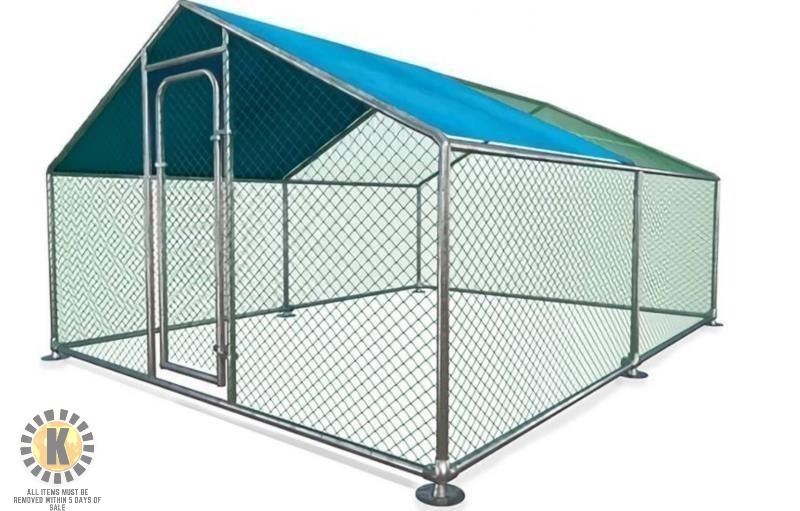 COVER IN BOX: UN-ASSEMBLED GALVANIZED METAL CHICKEN COOP, GALVANIZED DOOR WITH LOCK, WIRE MESH FOR FULLY ENCLOSED ROOF AND SIDES, WATERPROOF ROOF COVER, ASSEMBLY INSTRUCTIONS. MATERIAL: GALVANIZED TUBE CHICKEN COOP WITH CLOTH WATERPROOF COVER DIMENSIONS: 13.2 X 9.8 X 6.4 FEET COVER: FOR ONE PART OF THE RUN ONLY. WIRE MESH: COATED 1MM WIRE, SIZE APPROX. 35X35MM 32MM DIAMETER GALVANIZED STEEL TUBE COLOR: SILVER CHICKEN RUN WITH COVER (BLUE OR PURPLE DEPENDING ON STOCK).**THIS ITEM IS 2 BOXES**. ALL ITEMS MUST BE REMOVED WITHIN 5 DAYS OF SALE
