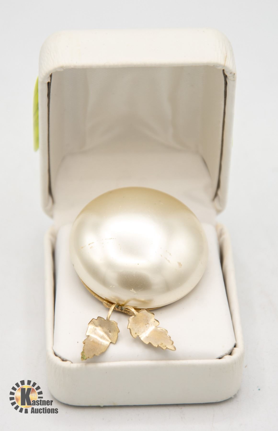 MEDIUM PEARL BEAD BROOCH W/ GOLD TONE LEAVES