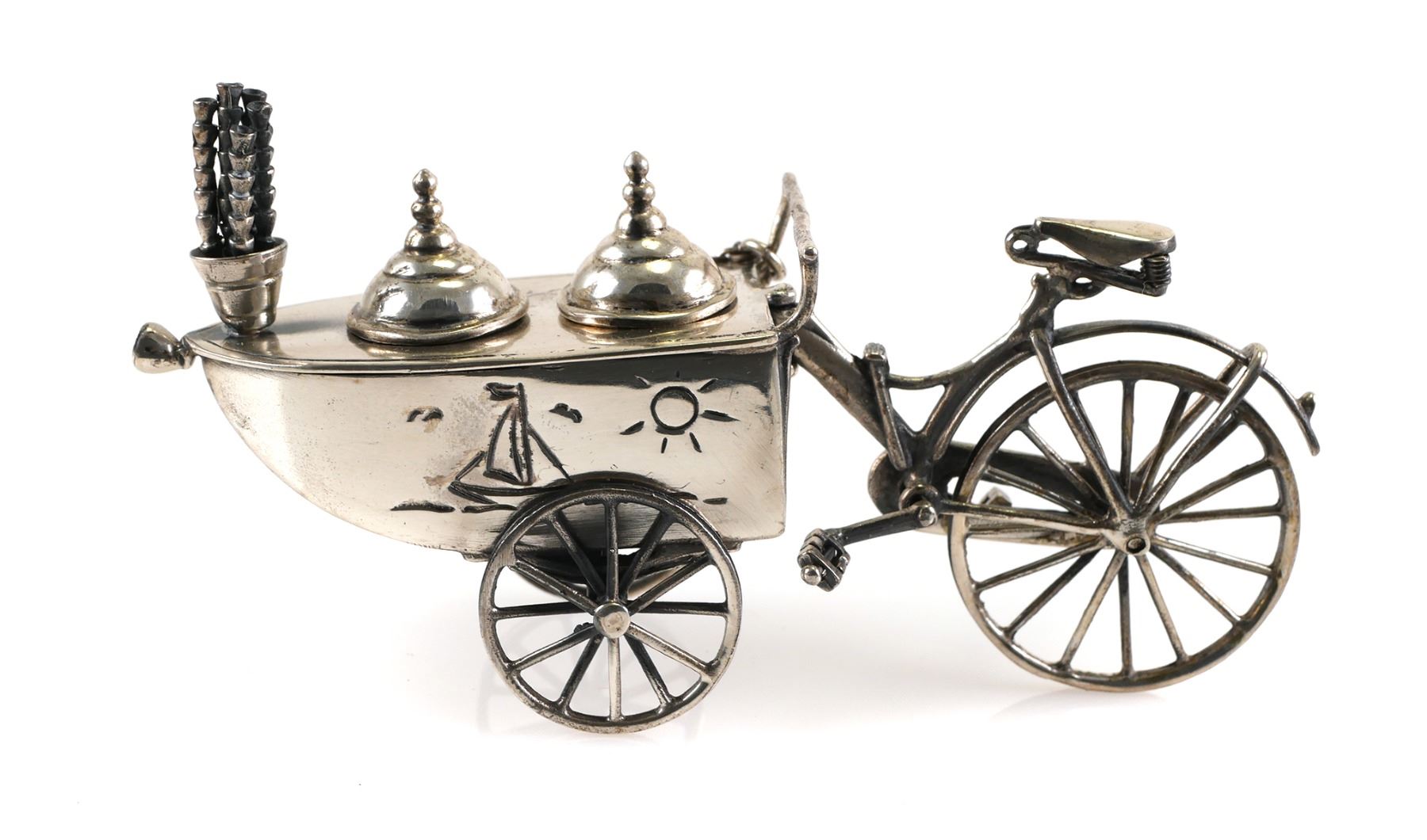 Vintage MEDUSA Miniature Sterling Ice Cream Cart. Solid Silver “Gelato” sellers cart was made by the Medusa Oro Silversmiths, Italy who specialized in silver doll house miniatures in the 1970s. Signed MEDUSA 925 and hallmarked on bottom. Measures approx. 4 1/8" long x 2" tall. Approx. 71.4 grams. Good condition, no breaks or repairs. General wear and tarnishing commensurate with age. From a large estate collection of dollhouse and silver miniatures, some of which are in today's sale.