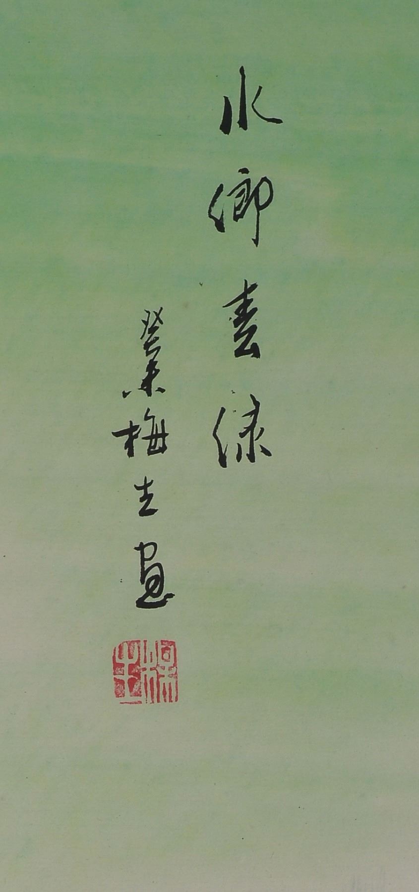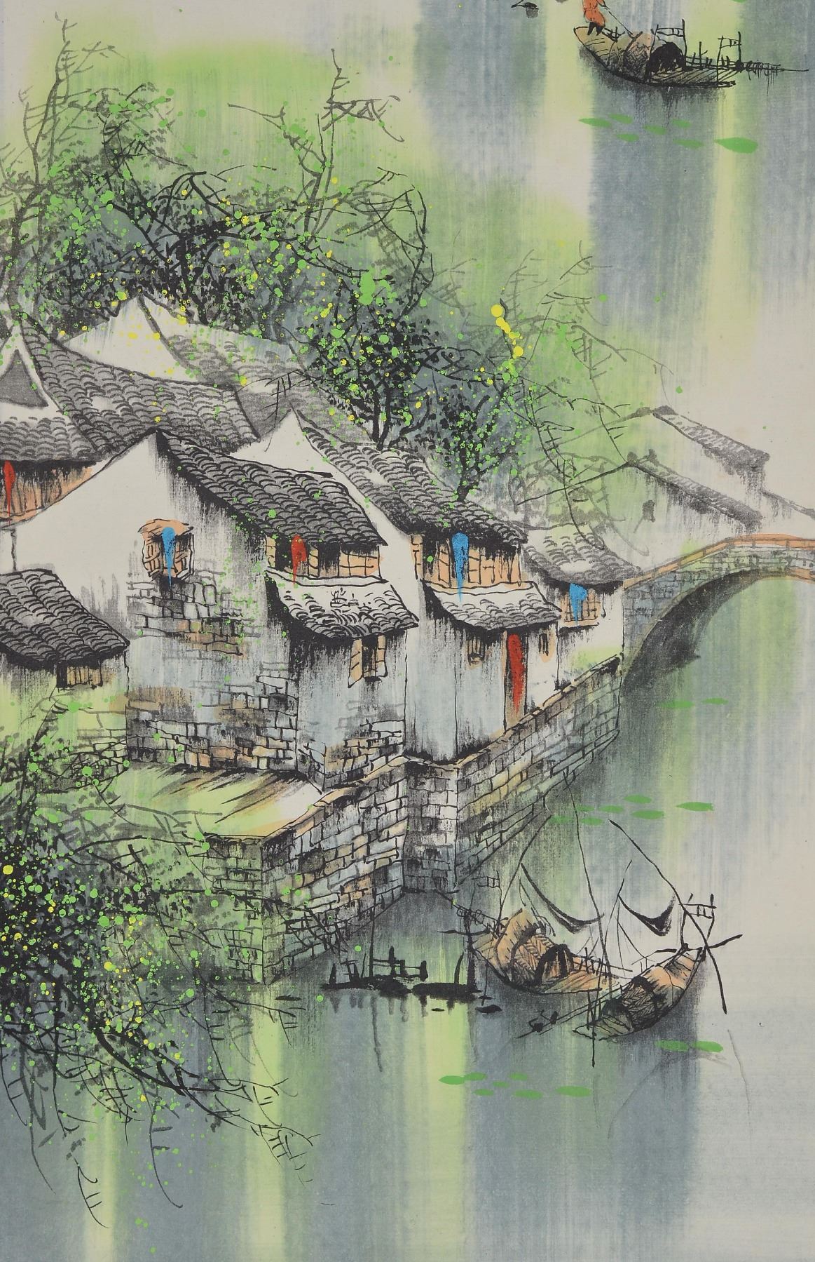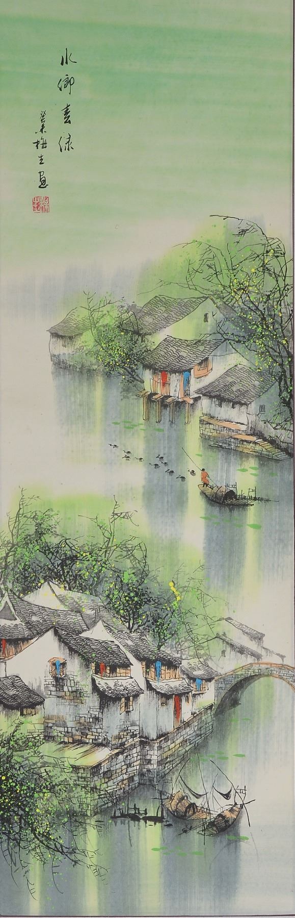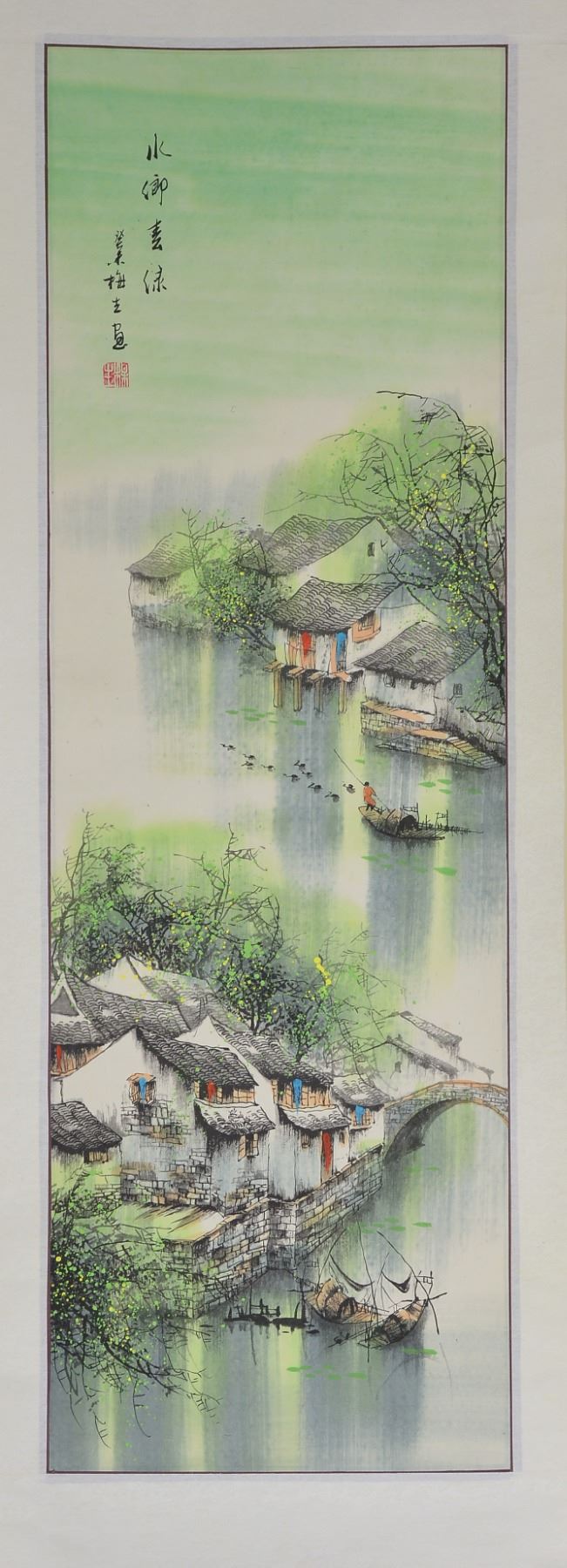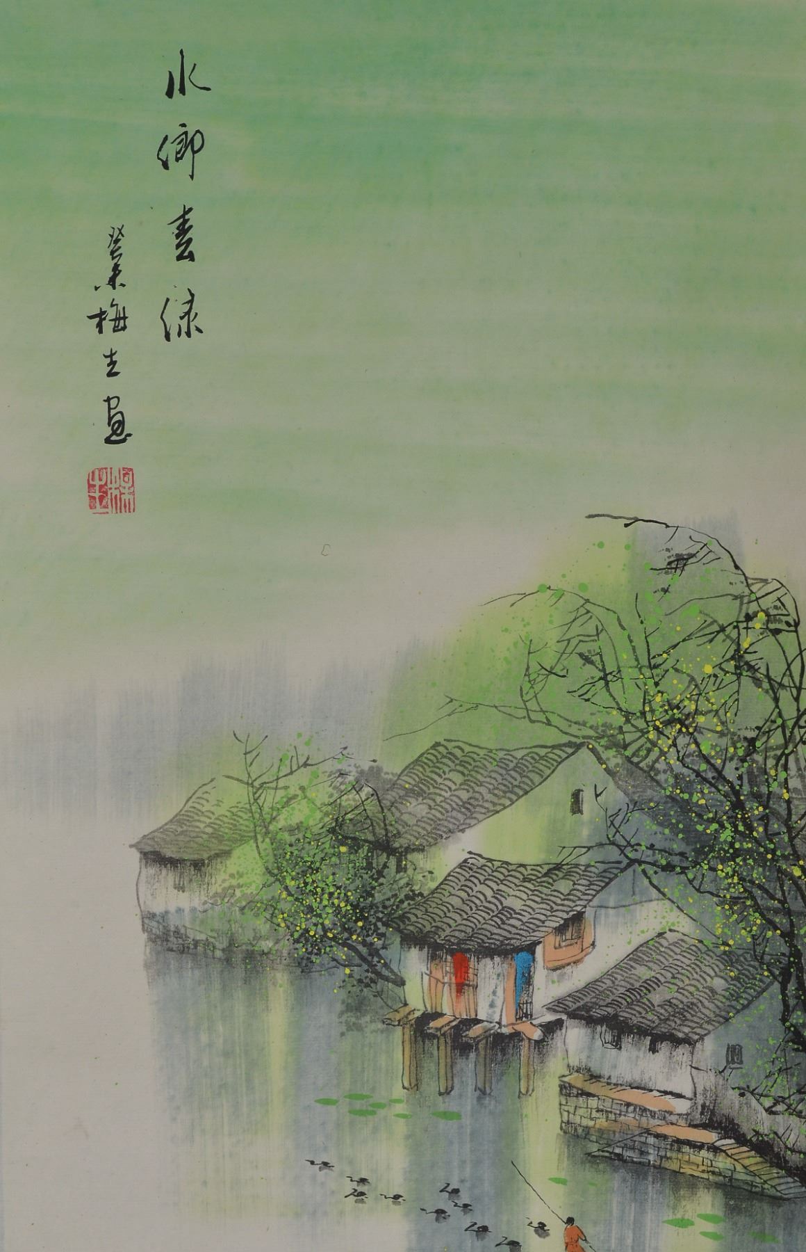 Ink and watercolor on paper, hanging scroll, featuring Chinese water town, signed and attr. Mei Sheng (Chinese), inscribed with 1 artist seal, 86.5 cm x 28 cm