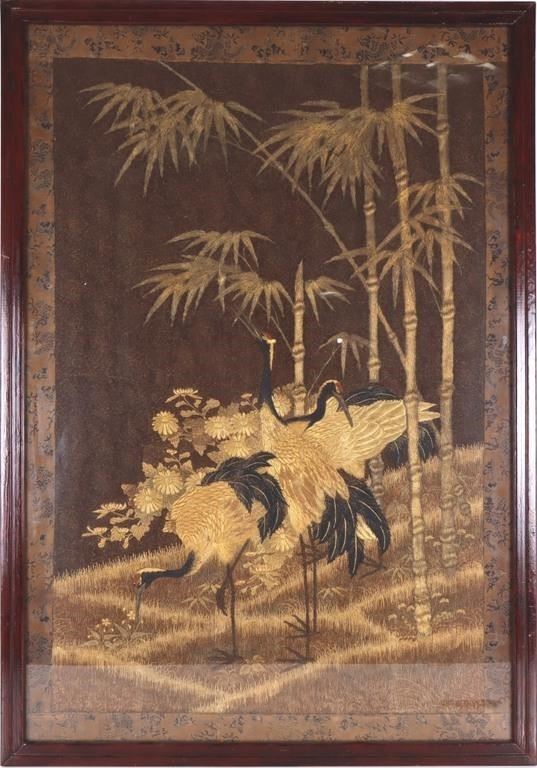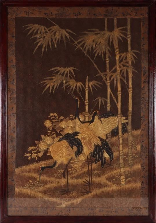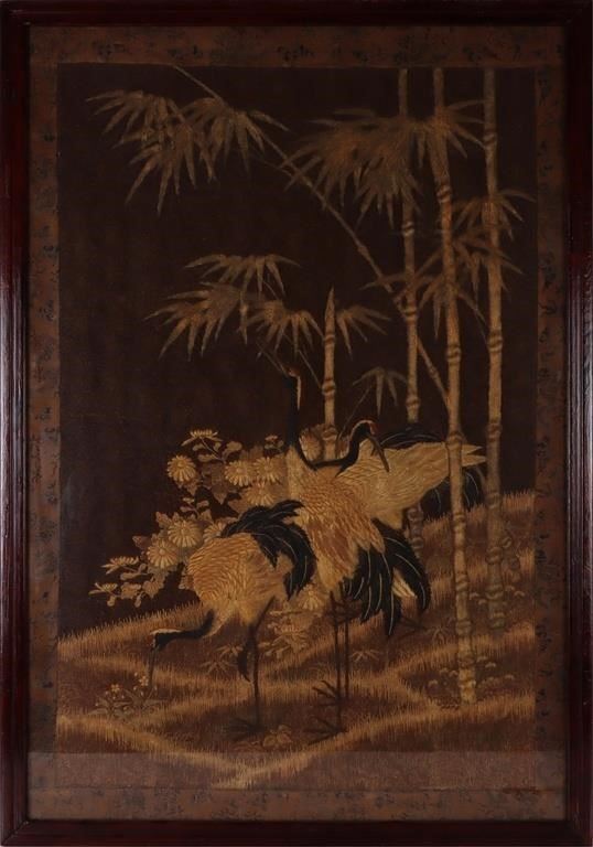 Beautifully crafted tapestry made with Japanese silk during the Meiji period. The tapestry depicts an elegant scene featuring cranes amidst a bamboo forest. Cranes are a significant symbol in Japanese culture, representing longetivity, good fortune, and peace. The design predomi8nantly uses gold and black color scheme, creating a striking contrast. The intricate embroidery captures fine textures in the cranes' feathers, bamboo leaves, and flowers. The piece is framed by a decorative border with patterns likely inspired by traditional Japanese motifs, enhancing the piece's overall aesthetic.