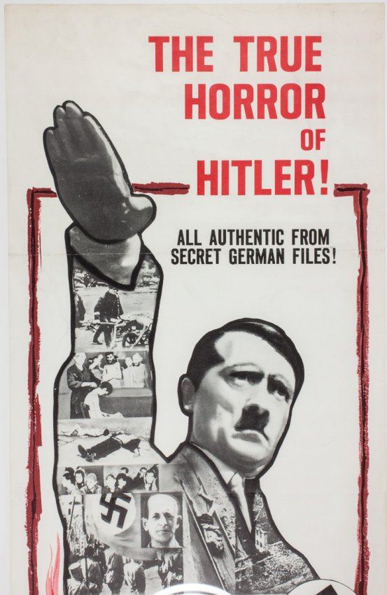 Film poster for the 1961 issue "Mein Kampf", 14" x 35 1/2", a montage of images which include death camp photos and a modern photo of the newly-captured Adolf Eichmann. The film, issued by Columbia Pictures, promised new material "All authentic from secret German files!", likely from Eichmann's revelations. Folds.