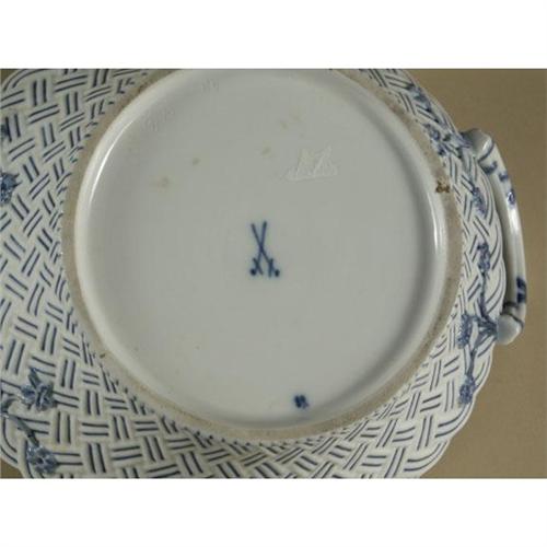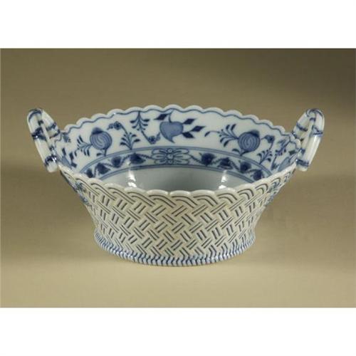 PORCELAIN: Meissen porcelain ''Blue Onion'' basket with applied handles, blue crossed swords hallmark with the additional numbering of ''89.'' in blue on underside, 7.5'' x 3.25'', no chips or crazing noted, minute casting crack at juncture of one handle.