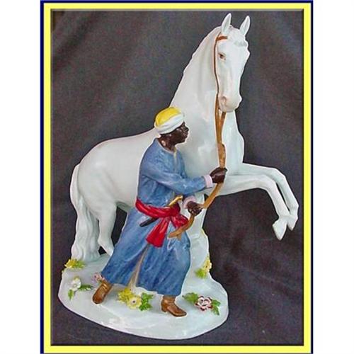 Antique large Meissen figurine of a Blackamoor / Turk leading a prancing horse. Made Germany, 19th century but originally modelled by Kaendler in the 18th century and known as: Moor with Spanish white horse.