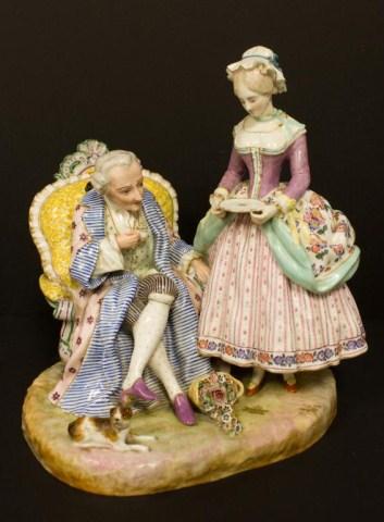 Depicts a man sitting and drinking tea and a woman serving the tea. Has cross swords mark on bottom. Measures 12 1/2" h X 12" w X 10" d.