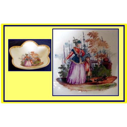 Meissen scalloped bowl. 19th century, German. 5 1/8inches accross at widest point. Nearly 2inches high. 5 deep lobes, bordered by rich gilt scrolling pattern. The inside of the bowl is painted with a marvellous scene of a mother, her son and their dog in a rich parkland or garden. Pillars with pot plants indicate that this is quite a formal garden, as do the tall, elegant trees in the background. The mother is very richly dressed in aristocratic attire of the 18th century. A puce silk skirt, rich red silk sleeves and bodice emerge from under a deep blue velvet jacket and complex curled hairdo under a feathered cap. The blond-curled little boy points to something in the distance, while the little dog prances off in that direction. Crossed swords under the glaze. Very good condition with no chips/cracks of any sort.