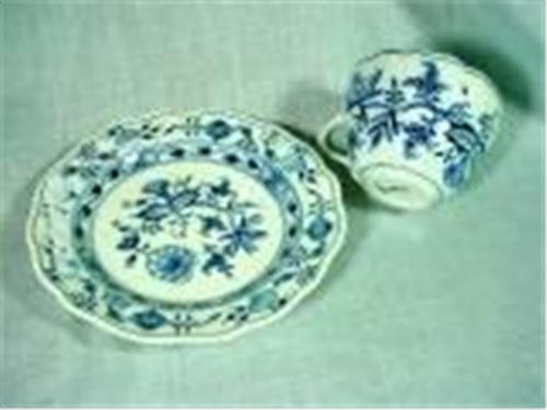 MEISSEN ONION PATTERN CUP AND SAUCER WITH OLD MAKERS MARK.