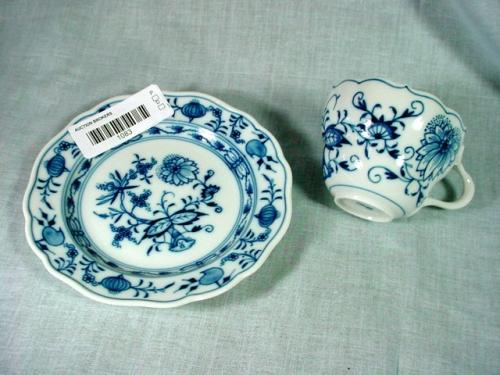 MEISSEN ONION PATTERN CUP AND SAUCER WITH OLD MAKERS MARK.