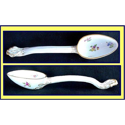 Meissen scoop / ladle, Germany 19th century.<BR>Measures 8 5/8inches long.<BR>Deep oval bowl with moulded leaves, highlighted in gold on the back, joined to a curving <BR>handle in the form of a branch, ending in a twisted, gilded bunch of twigs.<BR>Handpainted flowers scattered around the bowl. Underglaze blue crossed swords.<BR>Good condition - no damage / losses visible. Black light shows 2 negligible restored spots.