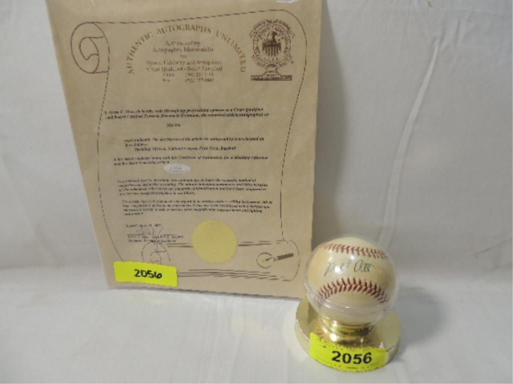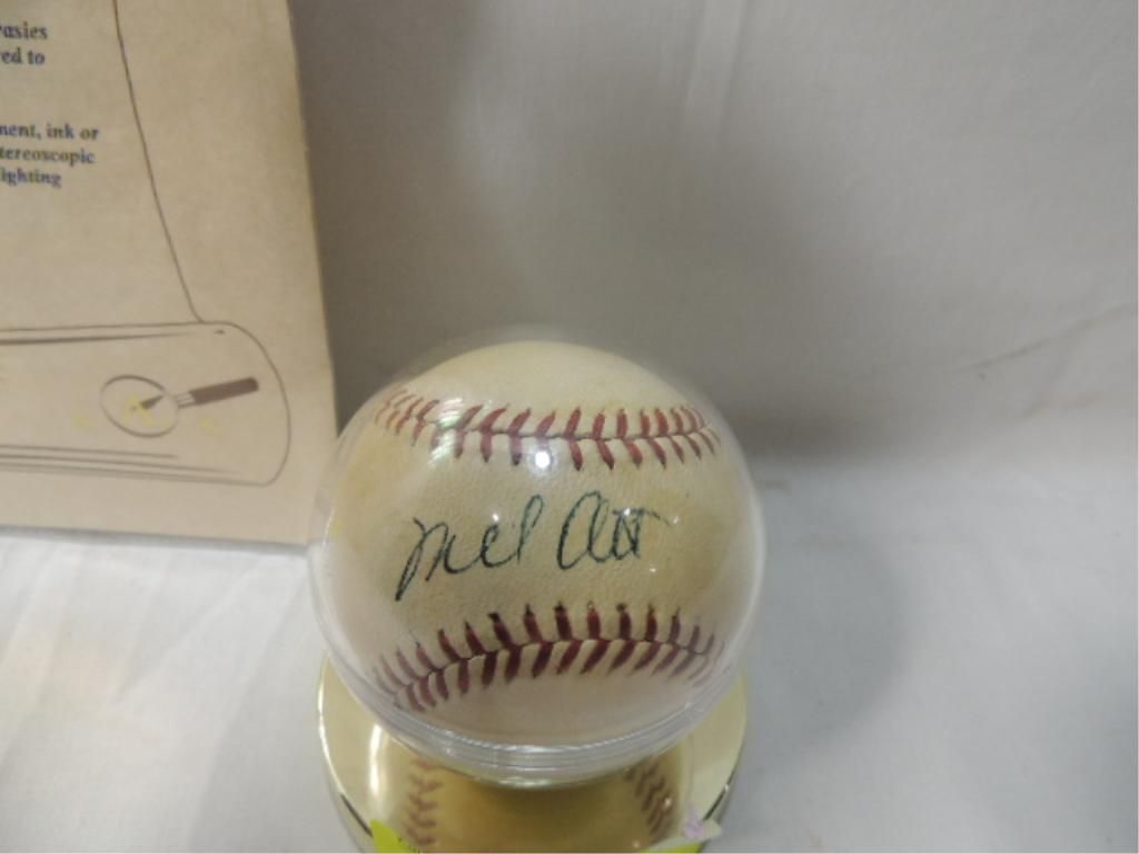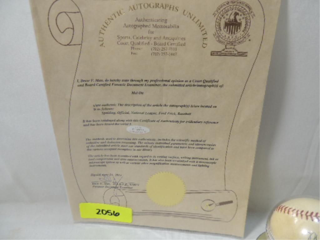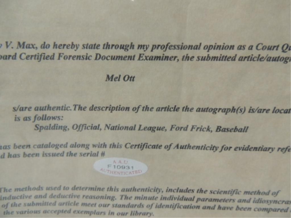 CERTIFICATE OF AUTHENTICITY FROM AUTHENTIC AUTOGRAPHS UNLIMITED. MEL OTT AUTO BALL. SEE PHOTOS FOR MORE DETAILS.