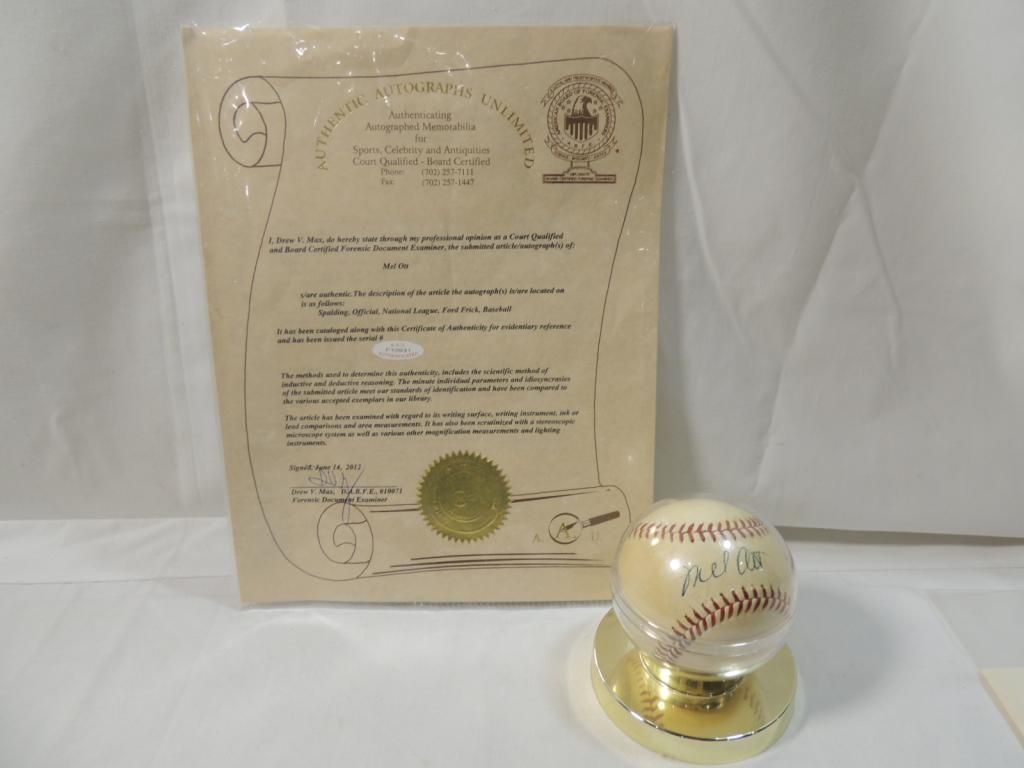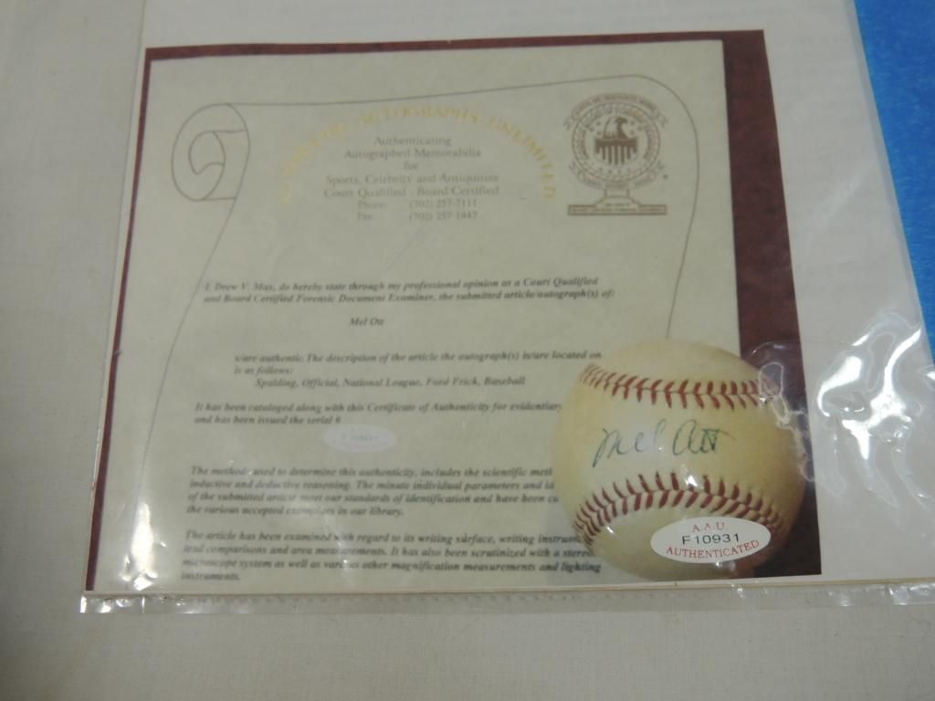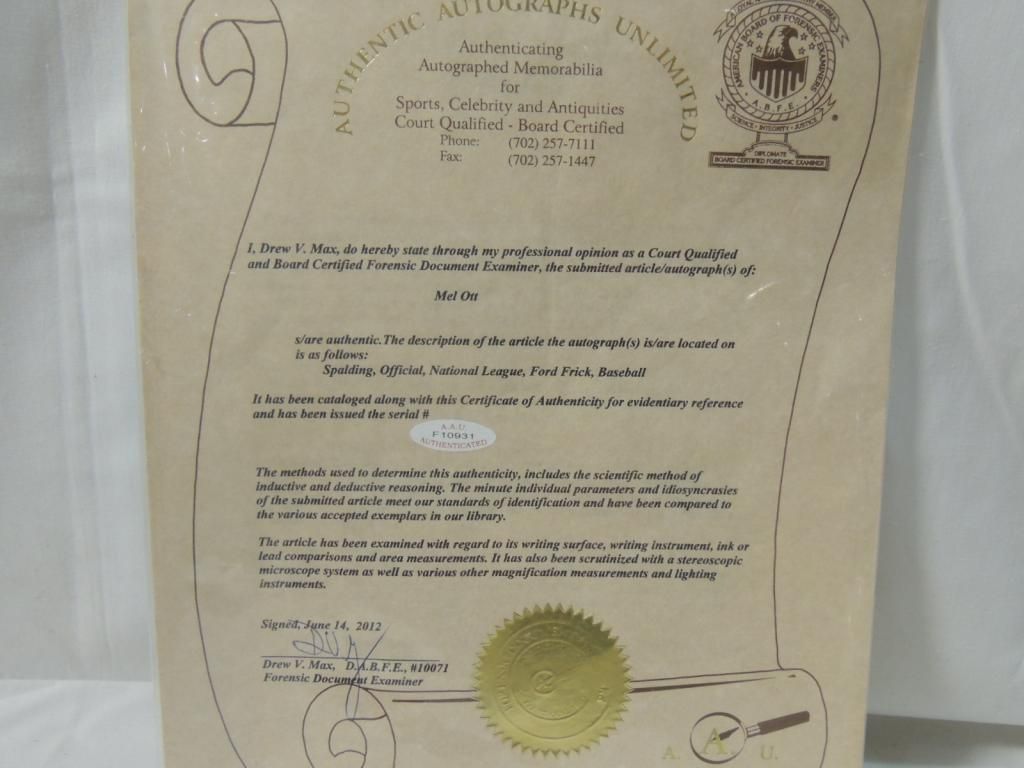 CERTIFICATE OF AUTHENTICITY FROM AUTHENTIC AUTOGRAPHS UNLIMITED. MEL OTT AUTO BALL. SEE PHOTOS FOR MORE DETAILS.