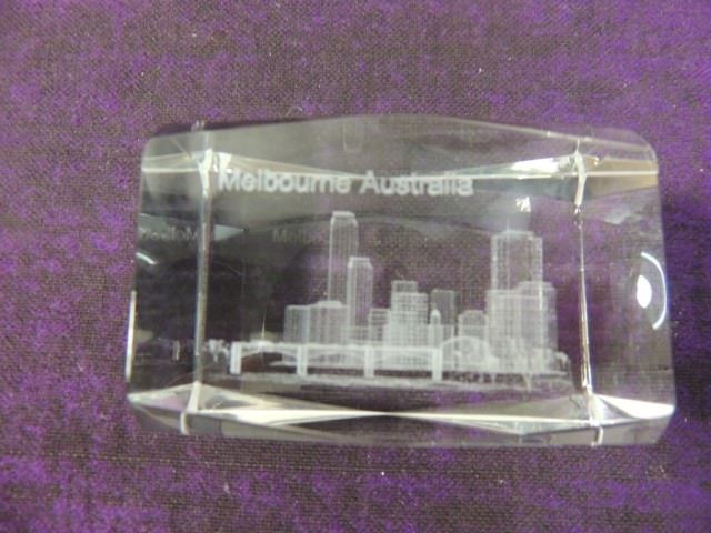 MELBOURNE AUSTRALIA LASER CUT GLASS PAPERWEIGHT
