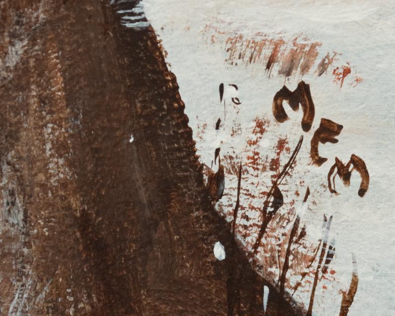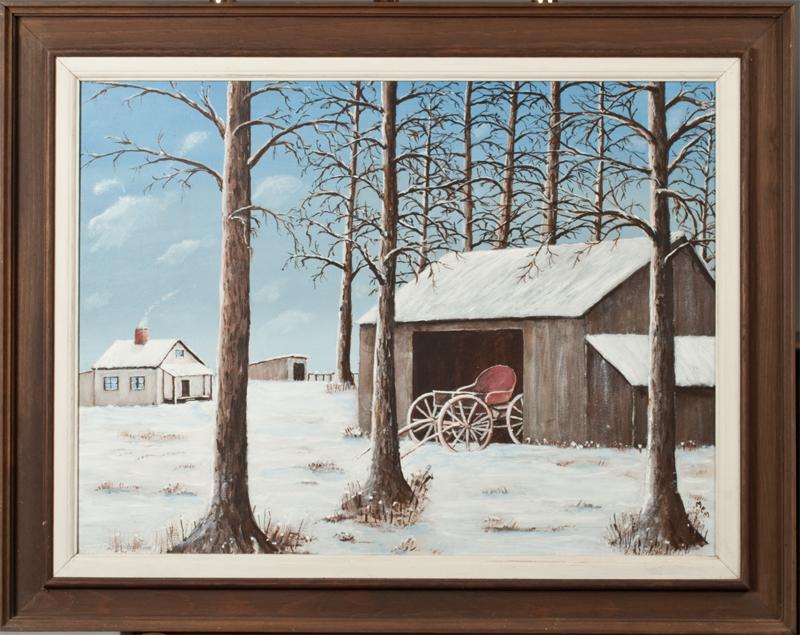 Painted to depict a winter scene with house, barn and carriage. 17.5" H x 23.5" W (sight) with 3" for frame. Monogramed in LR, circa 1970's.