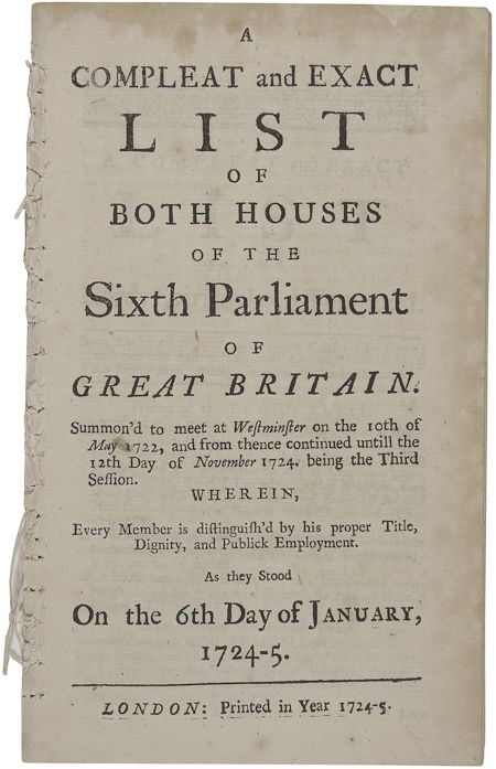 Printed document, "A Compleat and Exact List of Both Houses of the Sixth Parliament of Great Britain...As they Stood On the 6th Day of January, 1724-5", 40pp. 8vo., London, 1725, with every member listed including area represented, title, and employment, with King George II of course mentioned first. Disbound, very good.