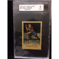 1951-52 PARKHURST PAUL MEGER ROOKIE HOCKEY TRADING CARD #2 (4 VGE)
