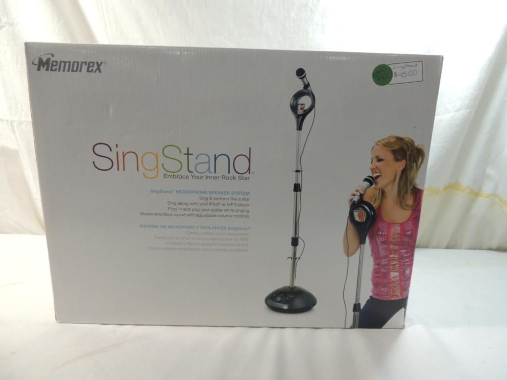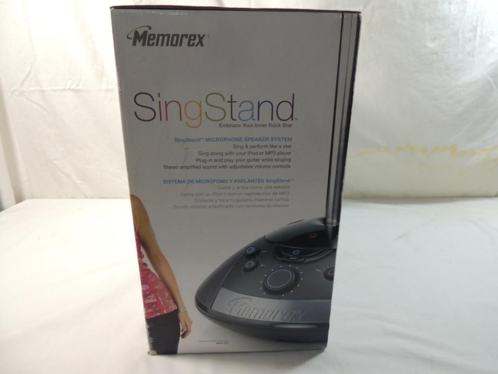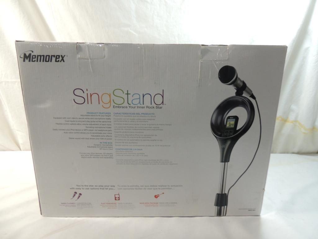 EMBRACE YOUR INNER ROCK STAR SING STAND MICROPHONE SPEAKER SYSTEM SING AND PREFORM LIKE A STAR. SING ALONG WITH YOUR IPOD OR MP3 PLAYER. PLUG IN AND PLAY YOUR GUITAR WHILE SINGING. STEREO AMPLIFIED WITH SOUND ADJUSTABLE VOLUME CONTROLS. AS SHOWN SEE PHOTO
