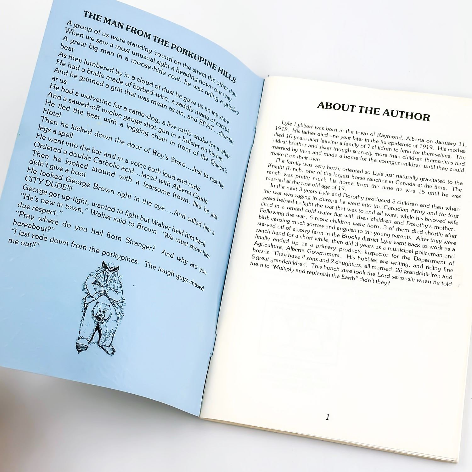 #8352 - PAPERBACK BOOK - 5.5” X 8.5” - 64 PAGES. SHORT STORIES WRITTEN BY LYLE R. LYBBERT - BORN IN RAYMOND, ALBERTA. AUTHOR, KNIGHT RANCH, CANADIAN ARMY, BROOKS, AGRICULTURE, ALBERTA GOVERNMENT. MAJORITY OF HIS STORYS WERE PUBLISHED IN WESTERN HORSEMAN, CANADIAN CATTLEMAN, FIELD & STREAM & RODEO ETC.