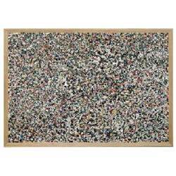 <b>Medium: </b>plastic and metal buttons and marbles, assorted other plastic and metal objects, sea shells and epoxy resin on wooden panel in artist’s wooden frame