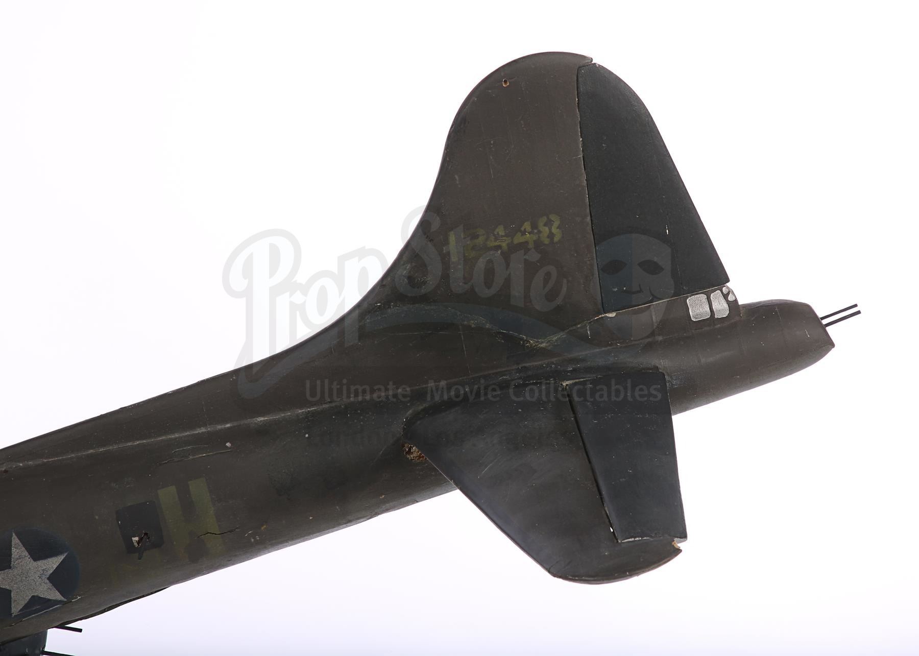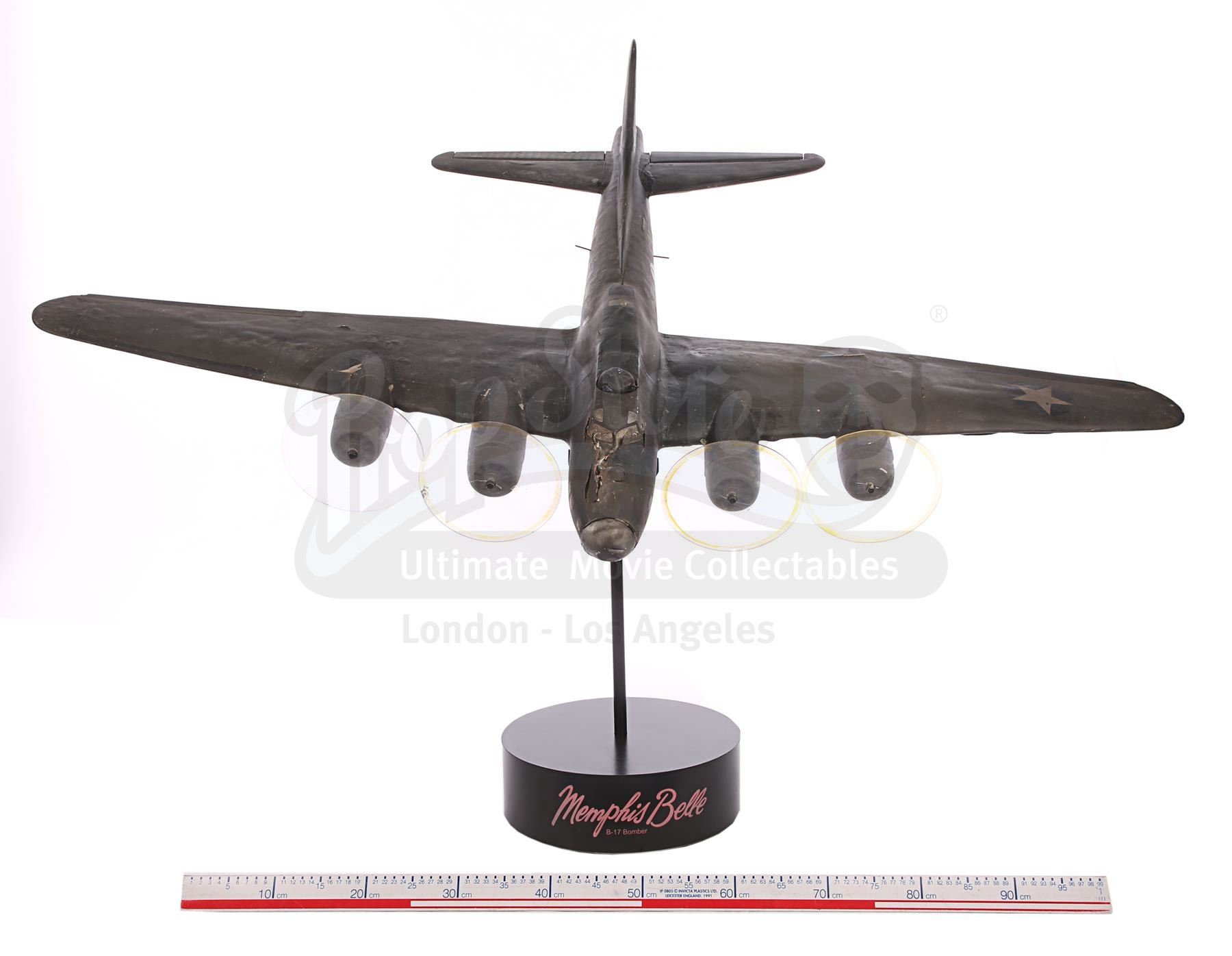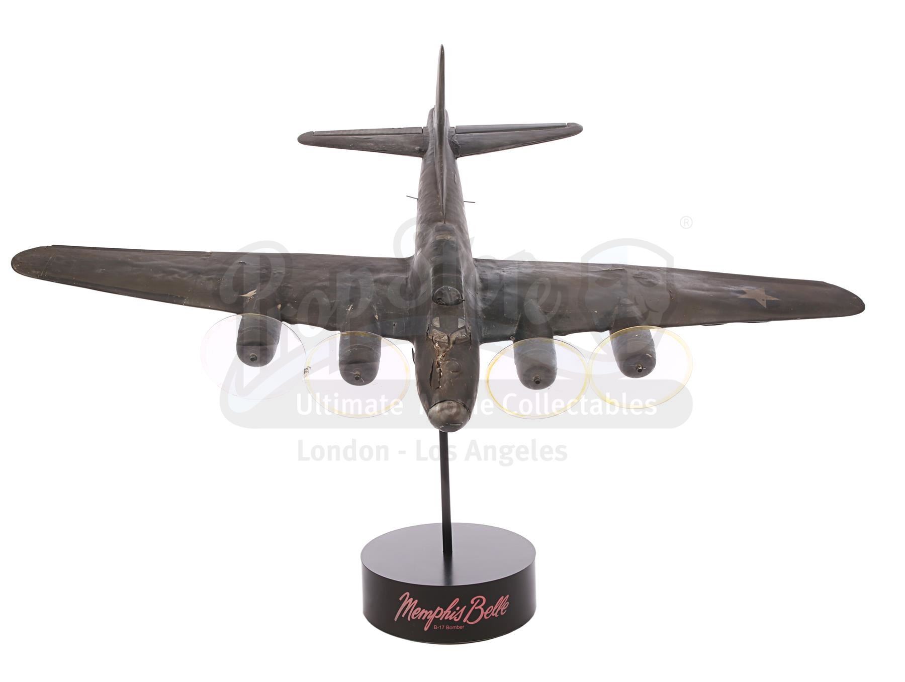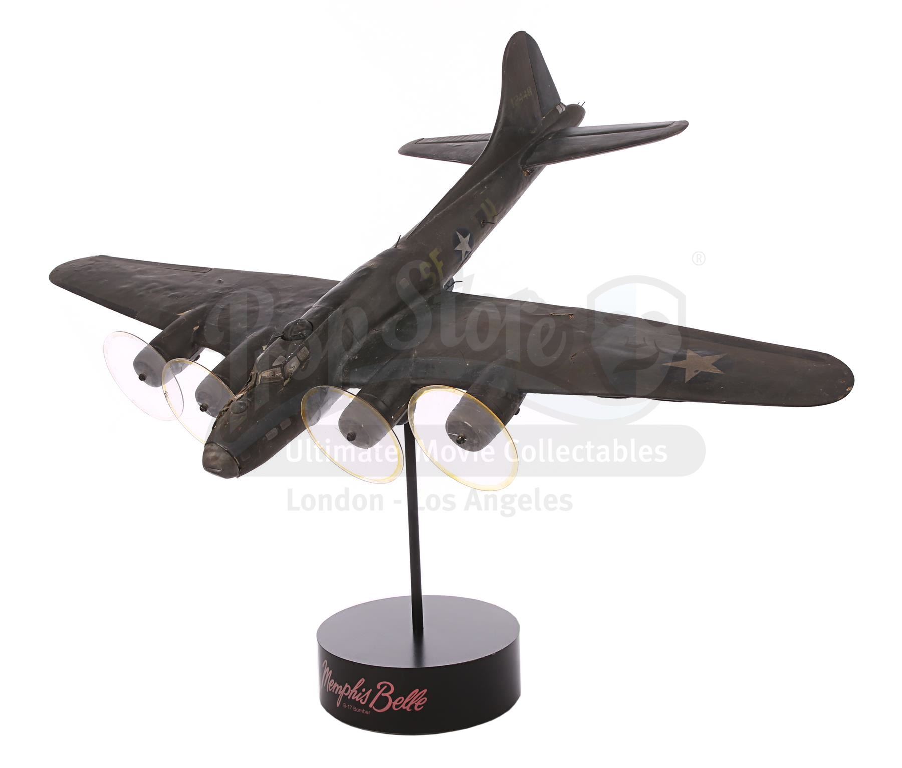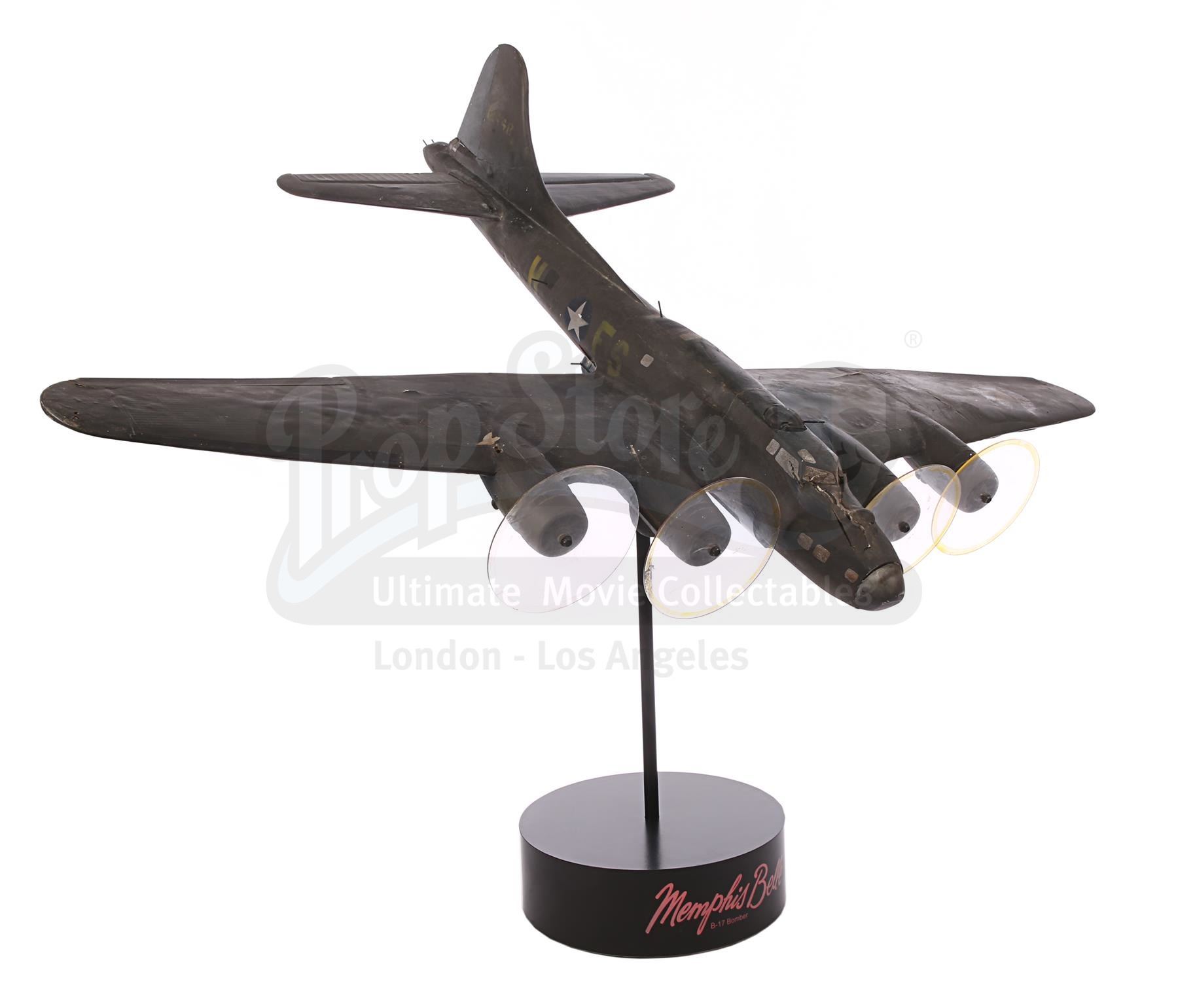 A model miniature flak-hit B-17 bomber from Michael Caton-Jones' World War II drama Memphis Belle. While real B-17s were used for filming in-flight close-ups, model miniatures were created for wide shots showing bomber squadrons passing over Nazi-occupied Europe in formation.