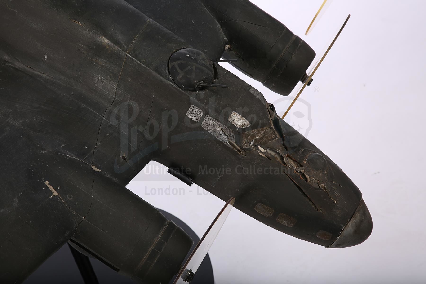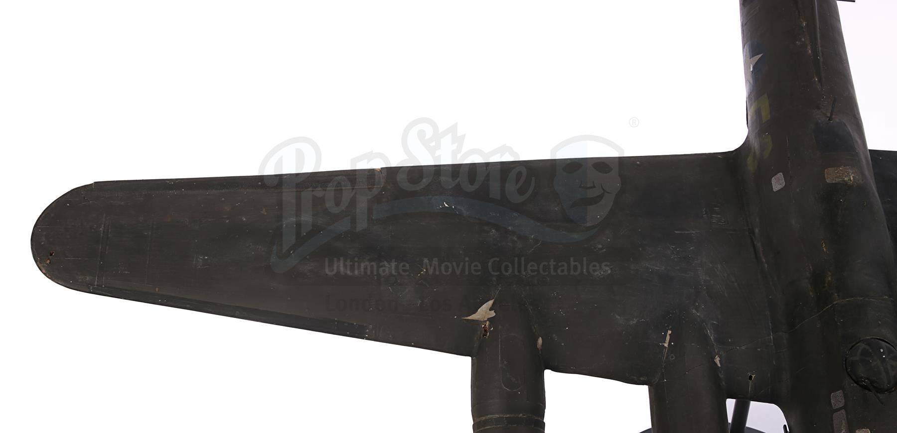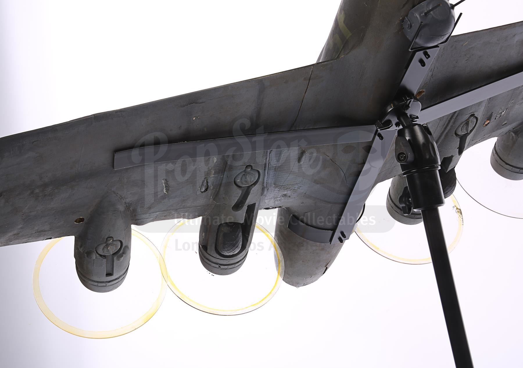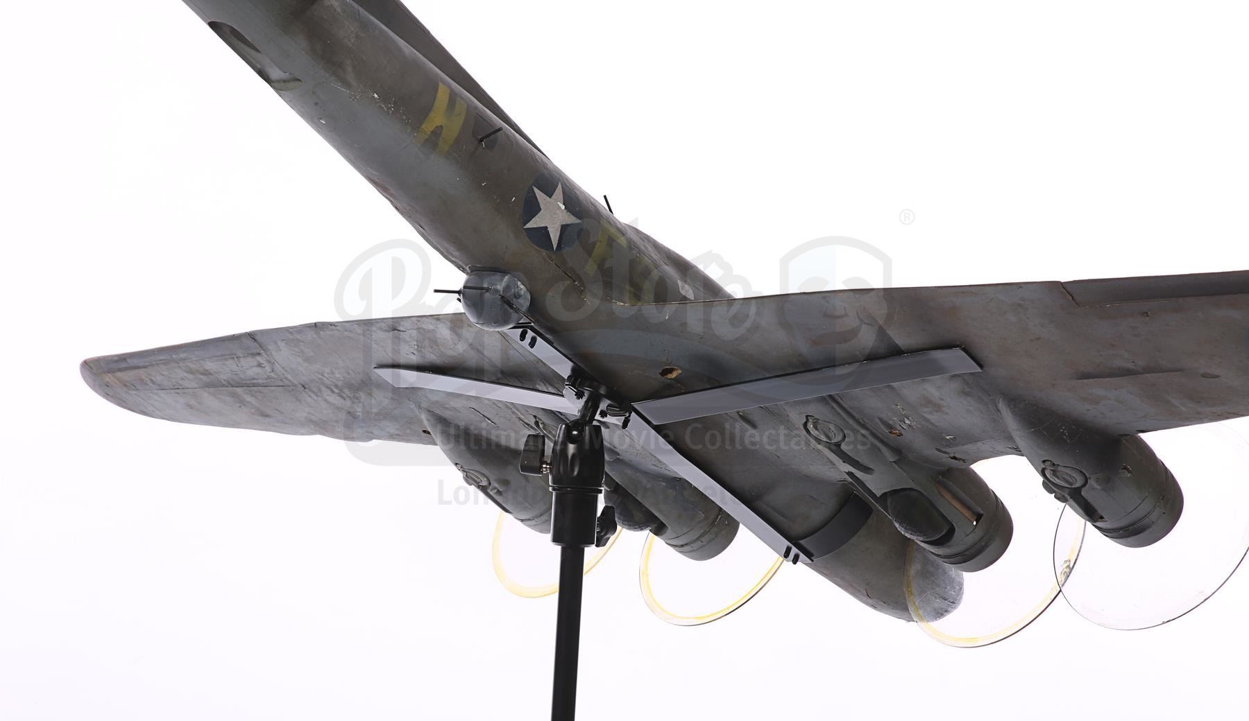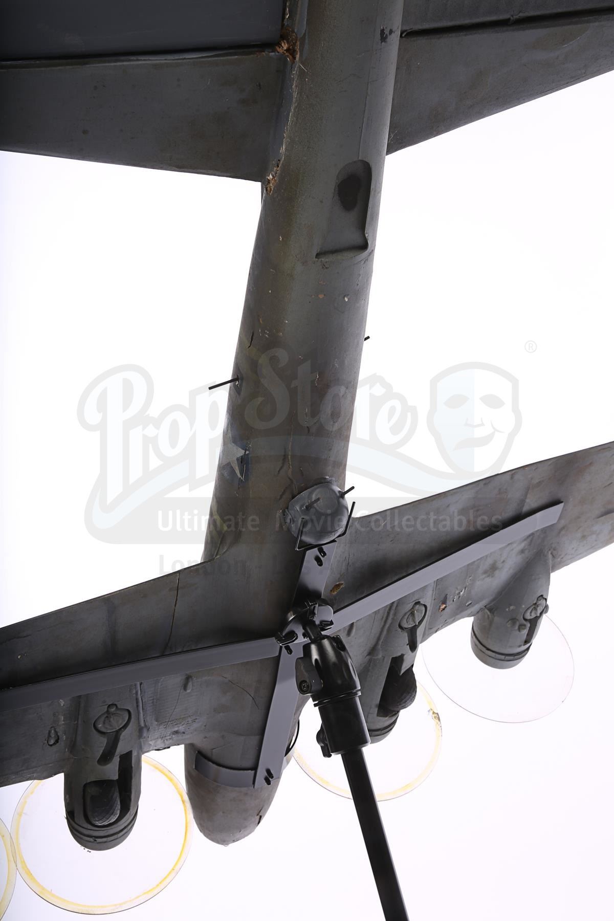 The model shows signs of deliberate production damage; the nose was distressed to appear like it had been hit by flak. There is additional wear from production use and age, including some cracks and dents on the wings. The model is mounted on a custom-made display featuring the film's logo, with an adjustable arm that allows the aircraft to be posed in different positions. Dimensions (displayed): 140 cm x 135 cm x 50 cm (55 1/4" x 53 1/4" x 20")