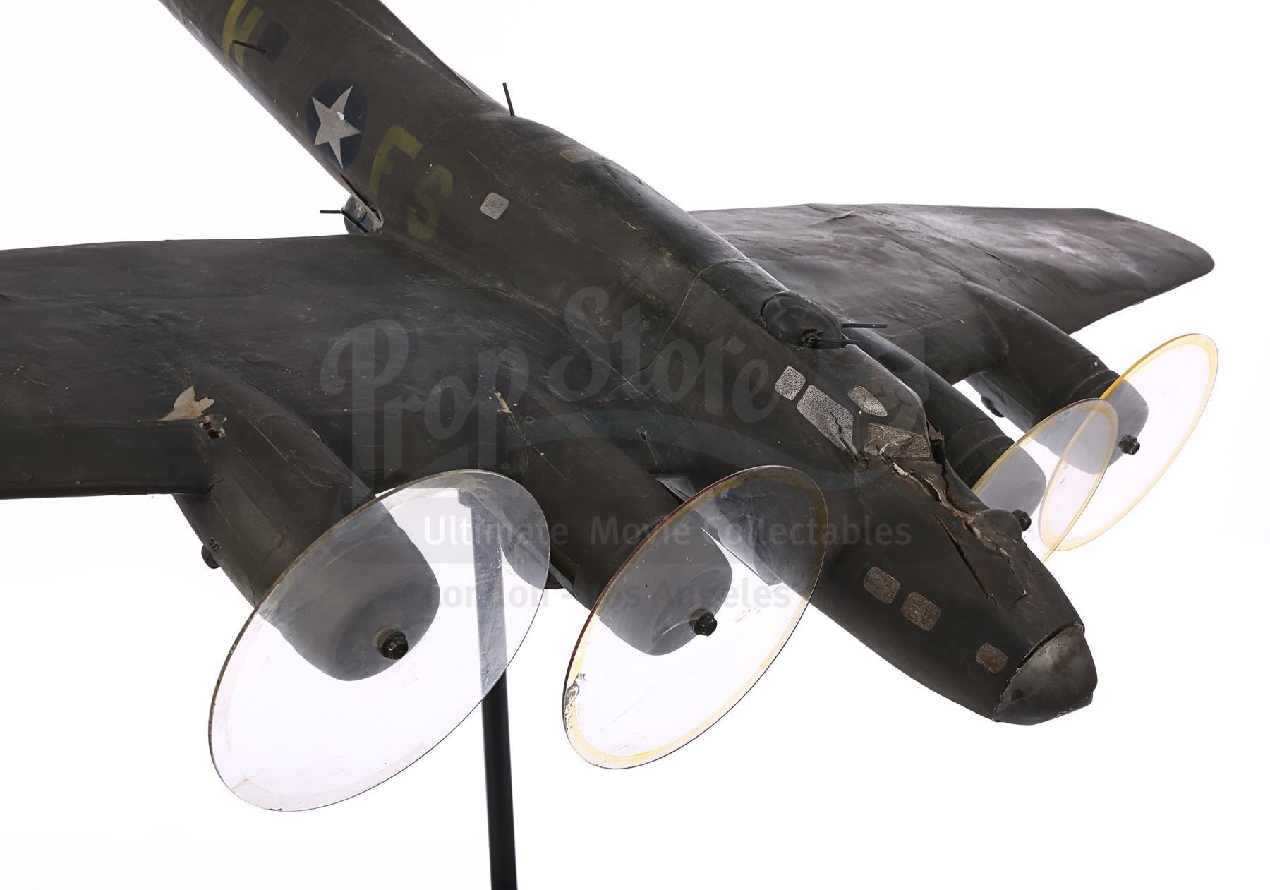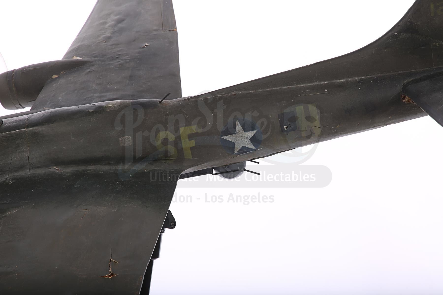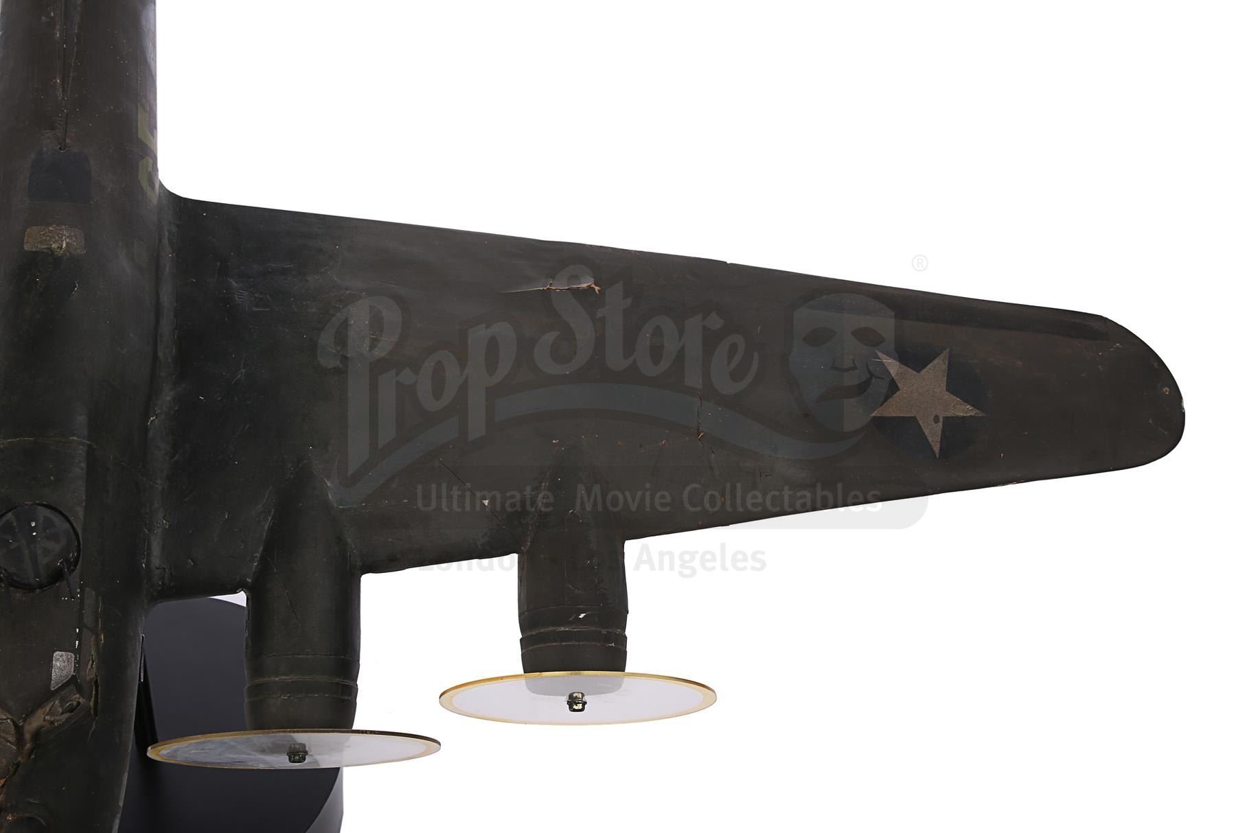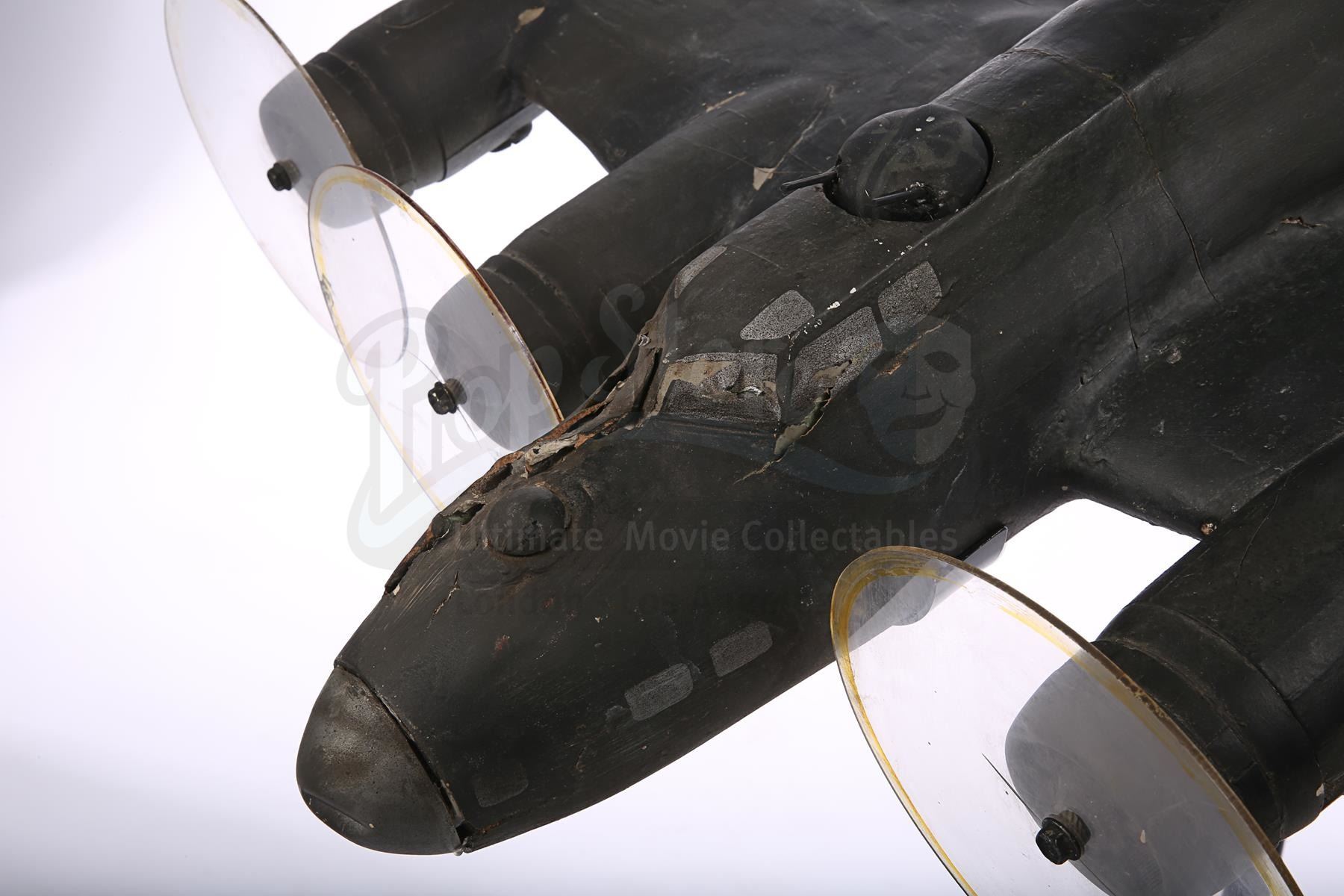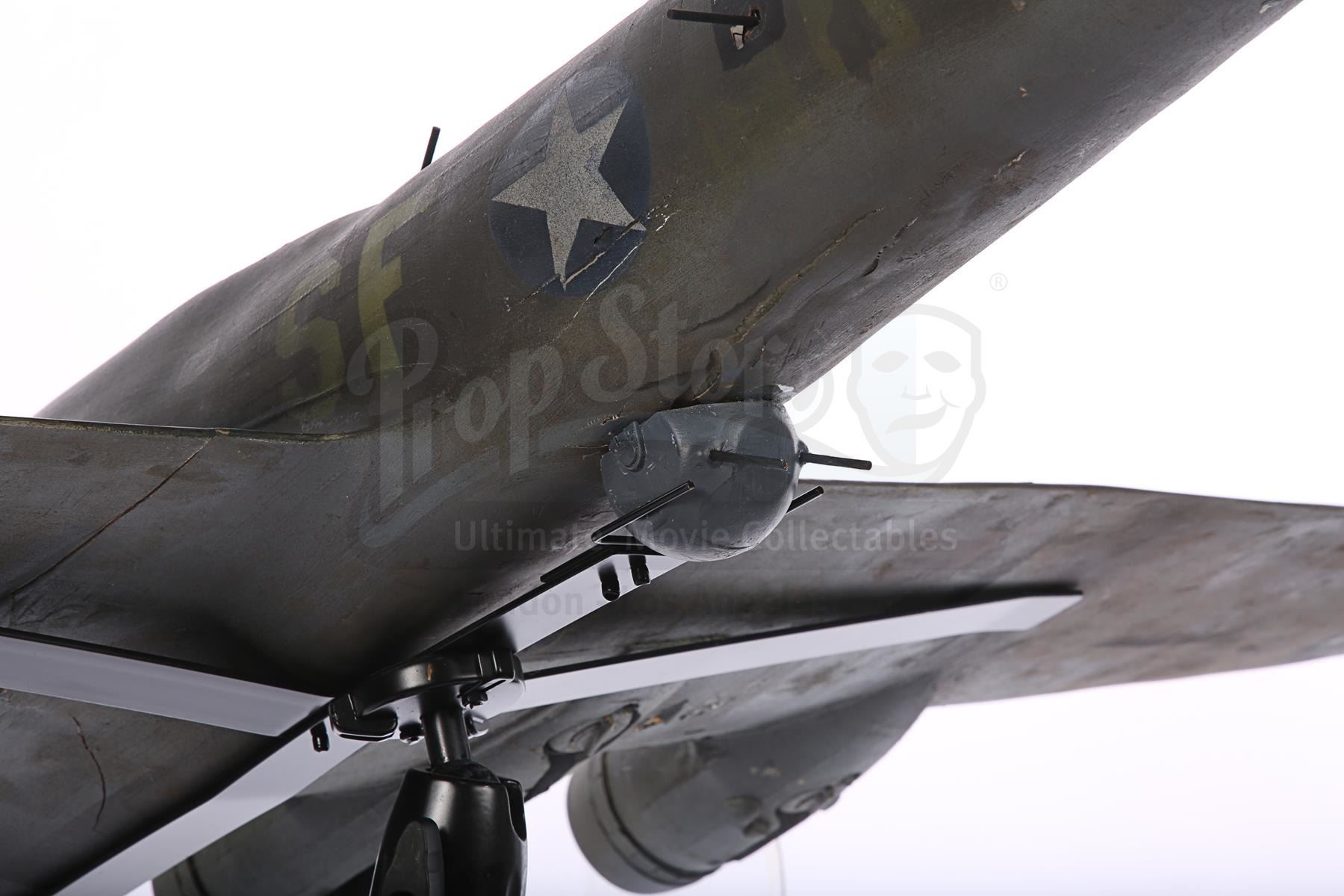 The model shows signs of deliberate production damage; the nose was distressed to appear like it had been hit by flak. There is additional wear from production use and age, including some cracks and dents on the wings. The model is mounted on a custom-made display featuring the film's logo, with an adjustable arm that allows the aircraft to be posed in different positions. Dimensions (displayed): 140 cm x 135 cm x 50 cm (55 1/4" x 53 1/4" x 20")