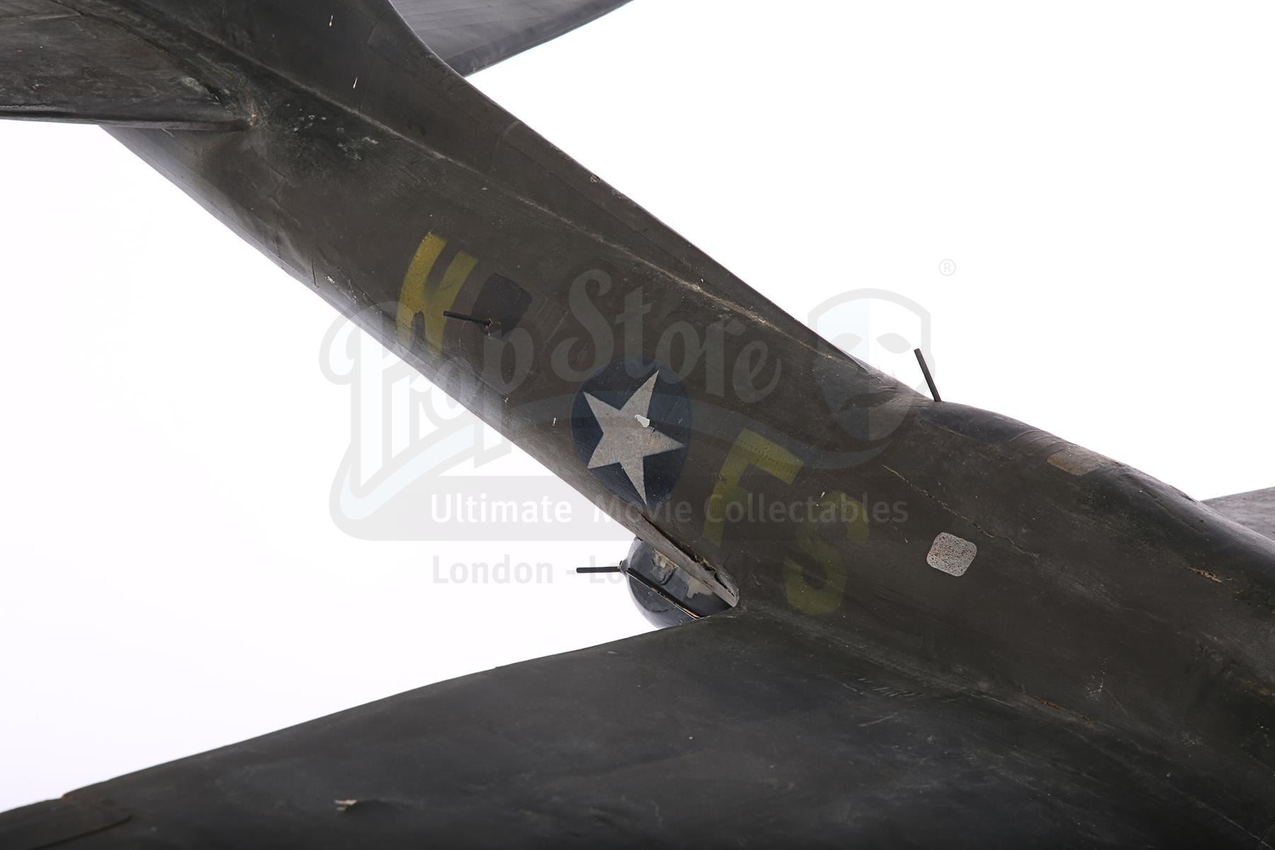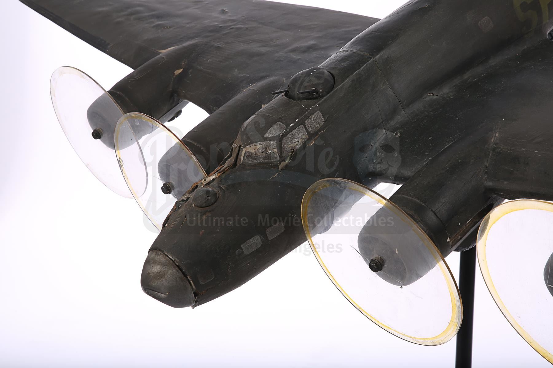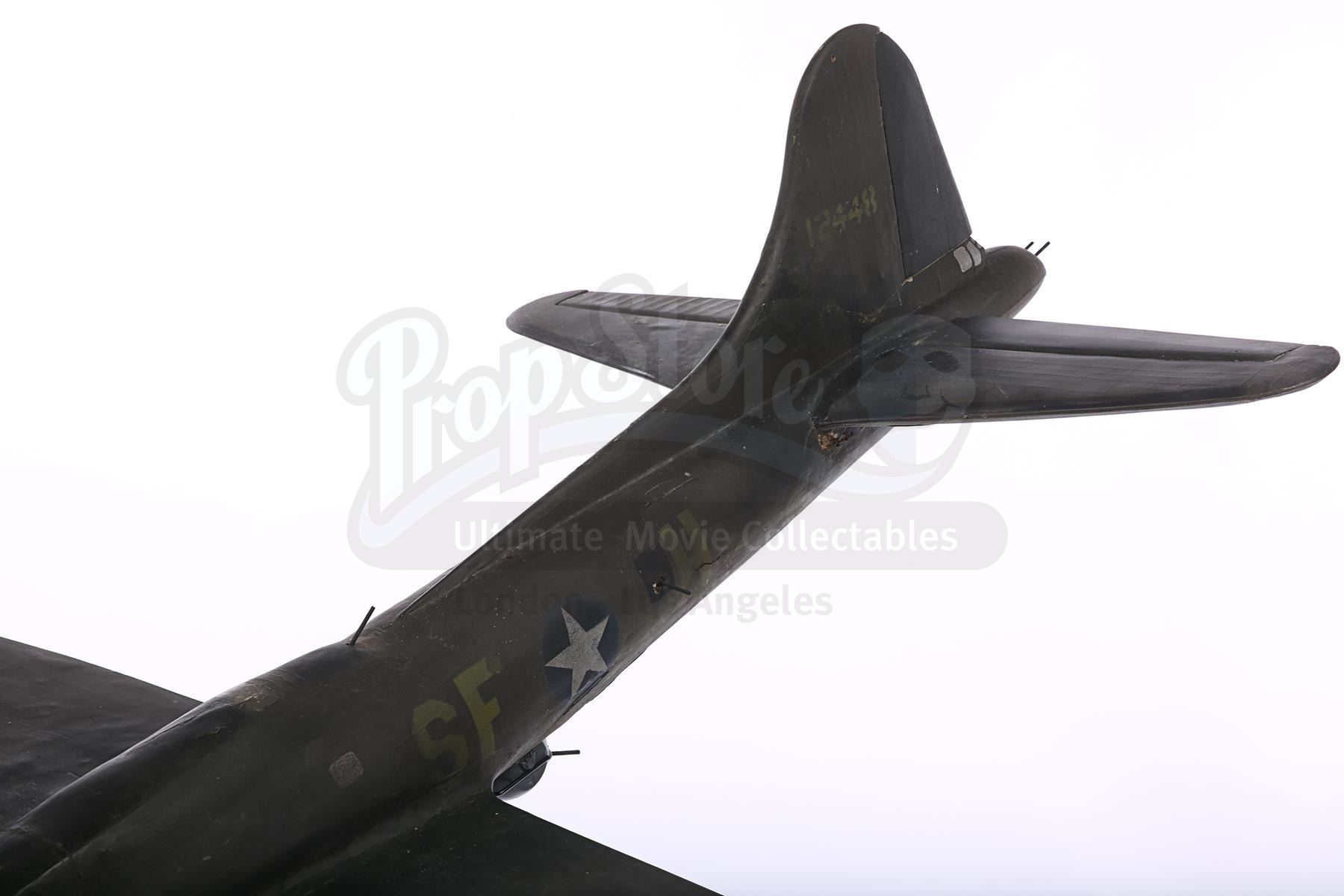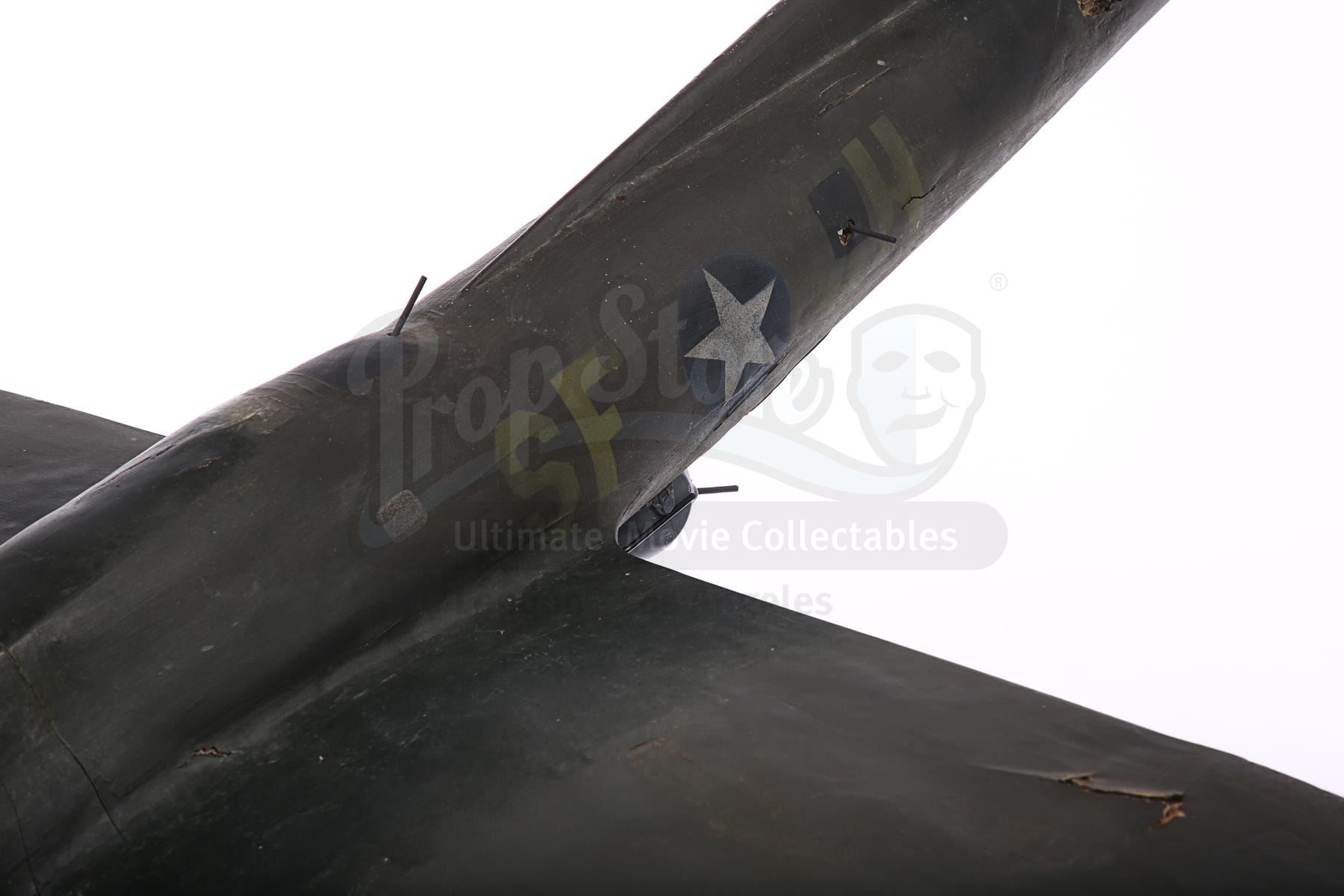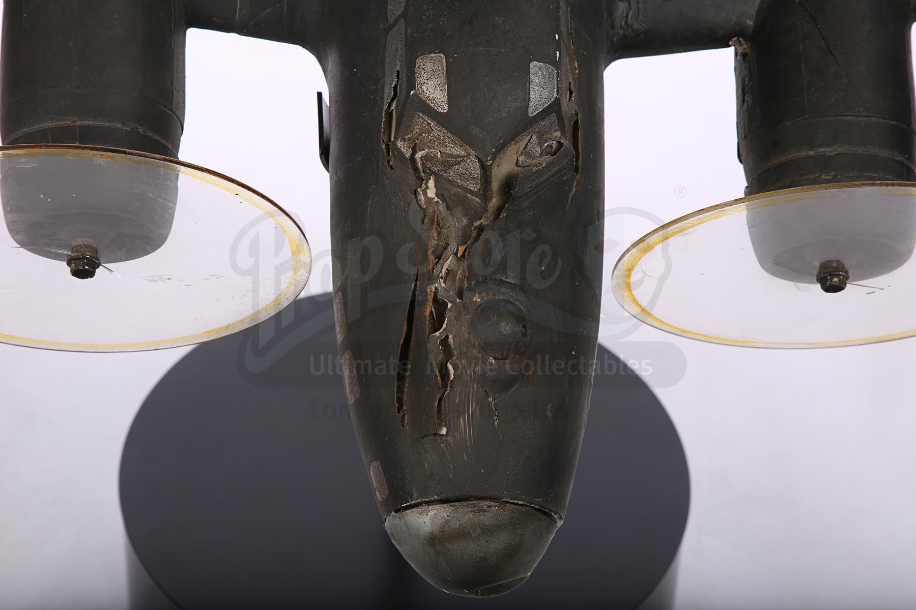 The model shows signs of deliberate production damage; the nose was distressed to appear like it had been hit by flak. There is additional wear from production use and age, including some cracks and dents on the wings. The model is mounted on a custom-made display featuring the film's logo, with an adjustable arm that allows the aircraft to be posed in different positions. Dimensions (displayed): 140 cm x 135 cm x 50 cm (55 1/4" x 53 1/4" x 20")