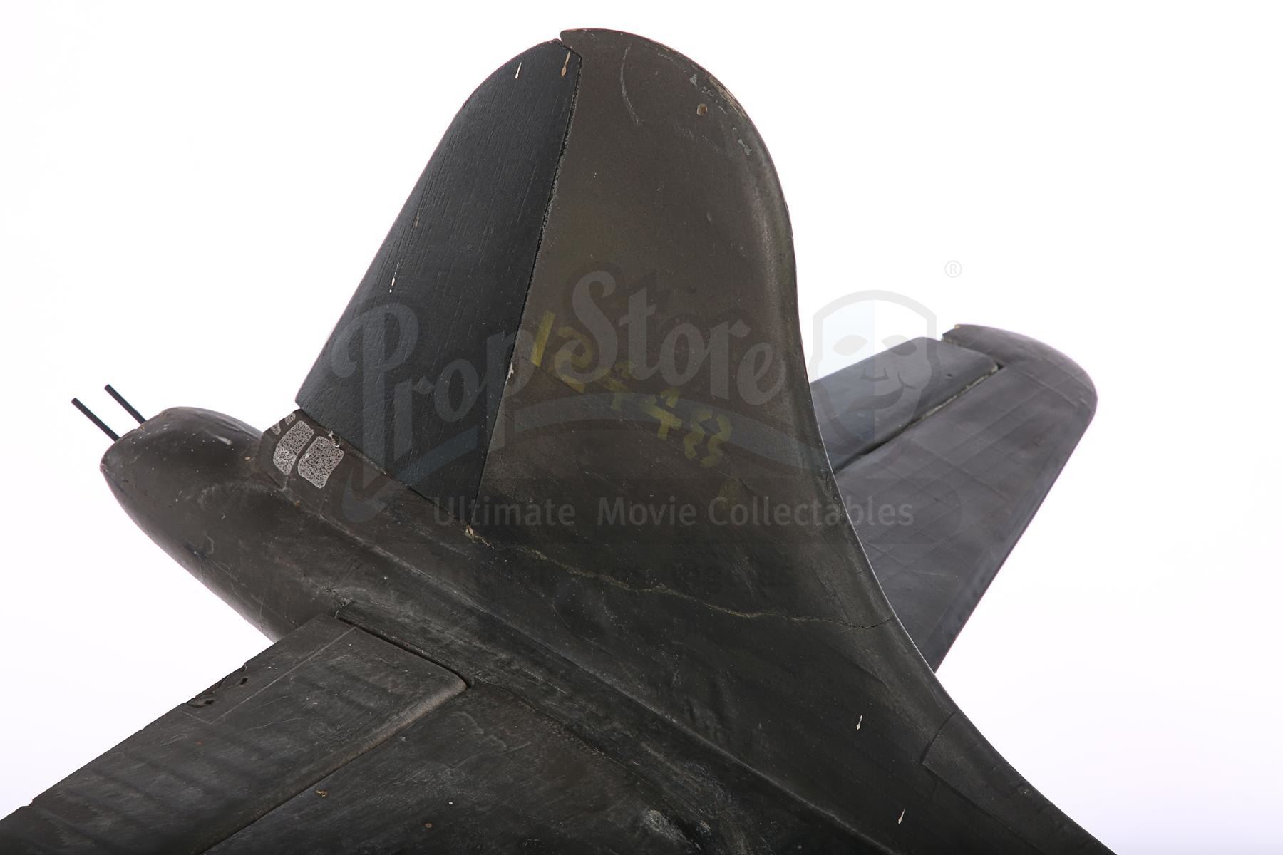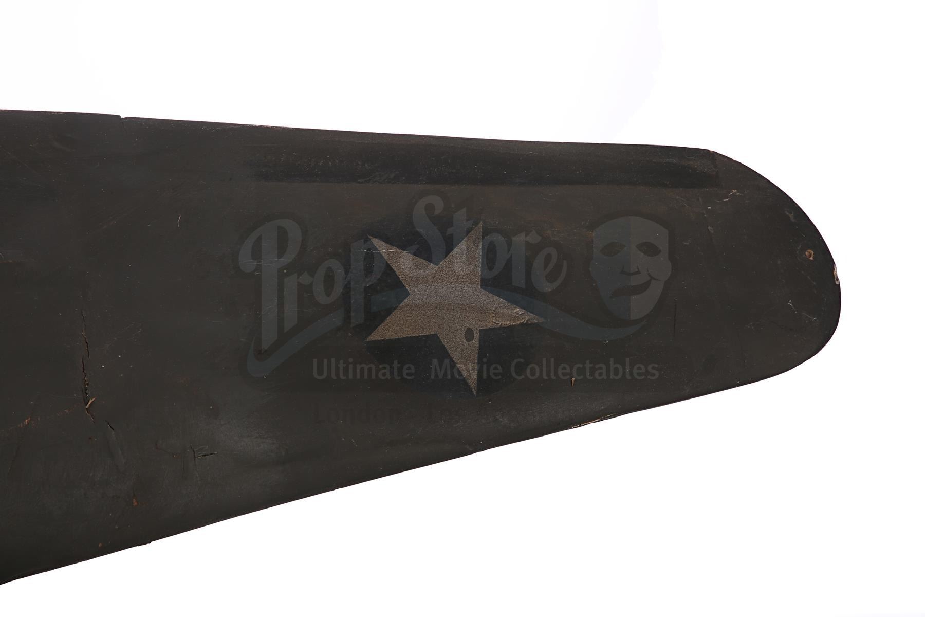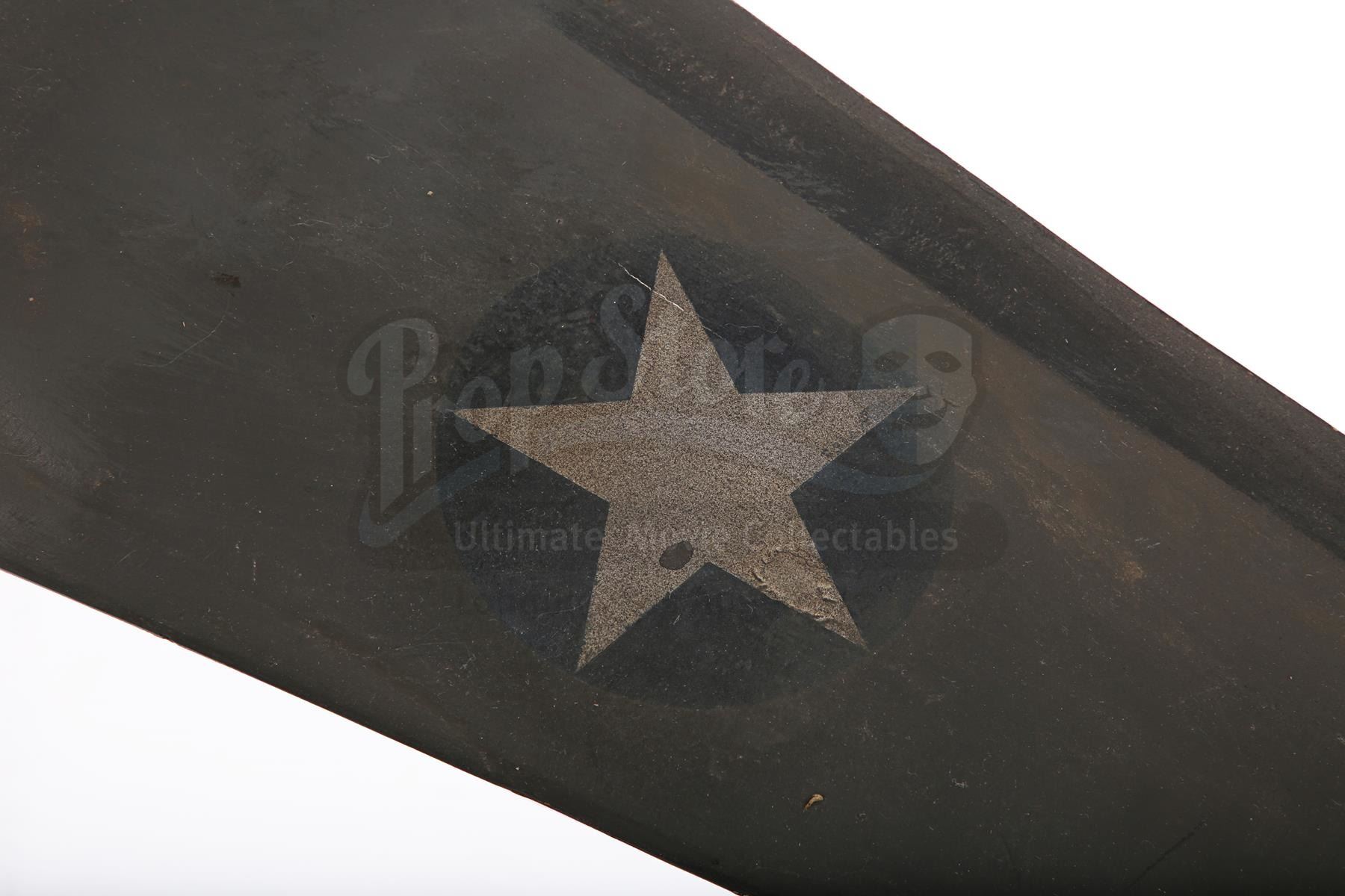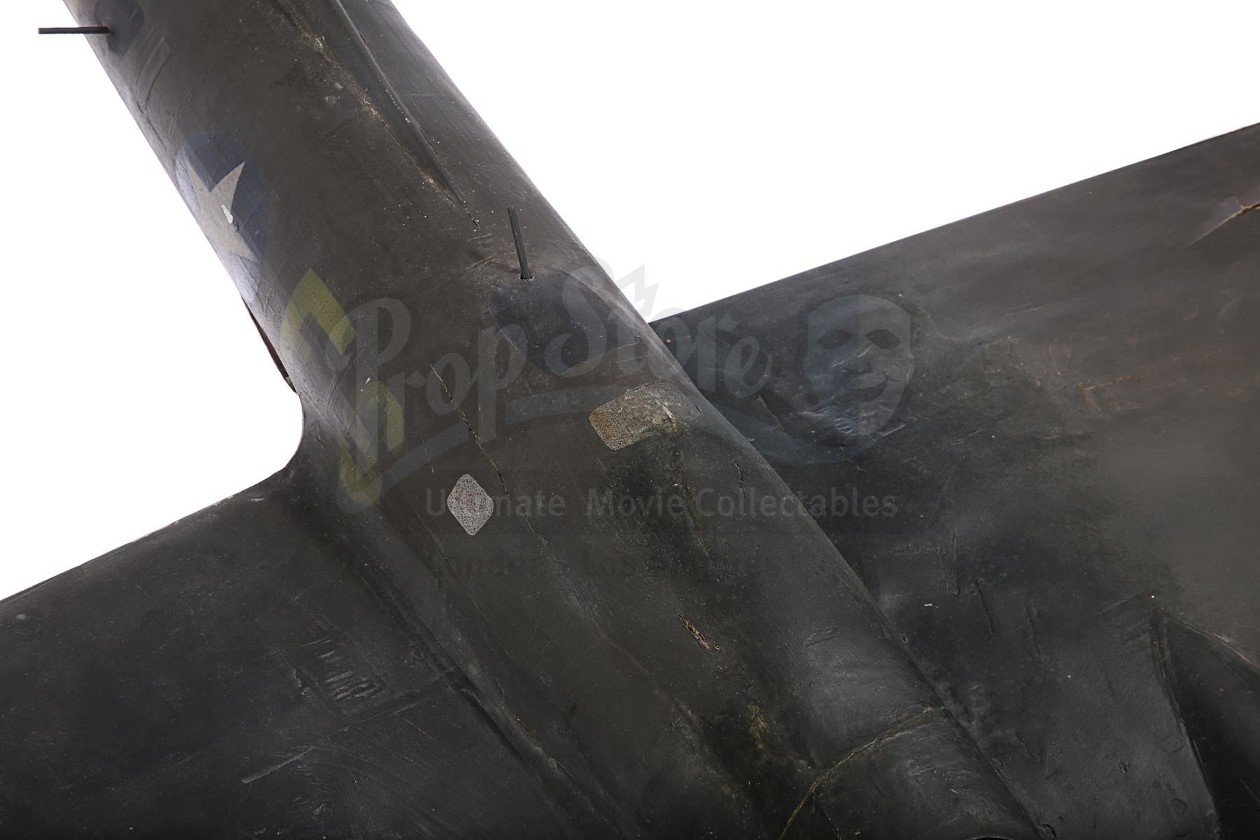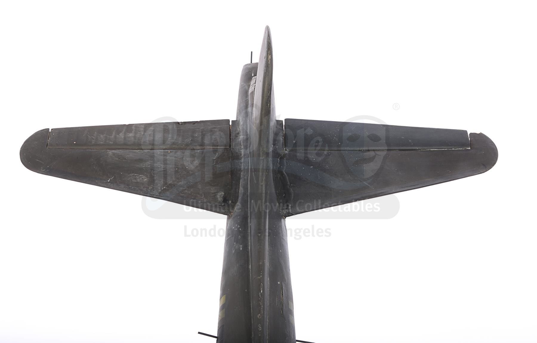 The model shows signs of deliberate production damage; the nose was distressed to appear like it had been hit by flak. There is additional wear from production use and age, including some cracks and dents on the wings. The model is mounted on a custom-made display featuring the film's logo, with an adjustable arm that allows the aircraft to be posed in different positions. Dimensions (displayed): 140 cm x 135 cm x 50 cm (55 1/4" x 53 1/4" x 20")