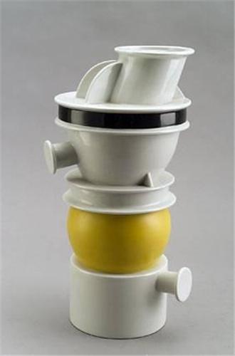 Ettore Sottsass<BR> Vase,<BR> Porzellan. Partiell gelb und schwarz bemalt. Hohe Form aus zylindrischen, abgerundeten und scheibenartigen Elementen mit Handhaben im unteren und oberen Bereich. H.: 39 cm. Bez.:Ettore Sottsass per Memphis. 1983<BR> Lit.: Höger, H.: Ettore Sottsass jun., Designer, Artist, Architect, Tübingen 1993, Abb. 86, S. 191.<BR>