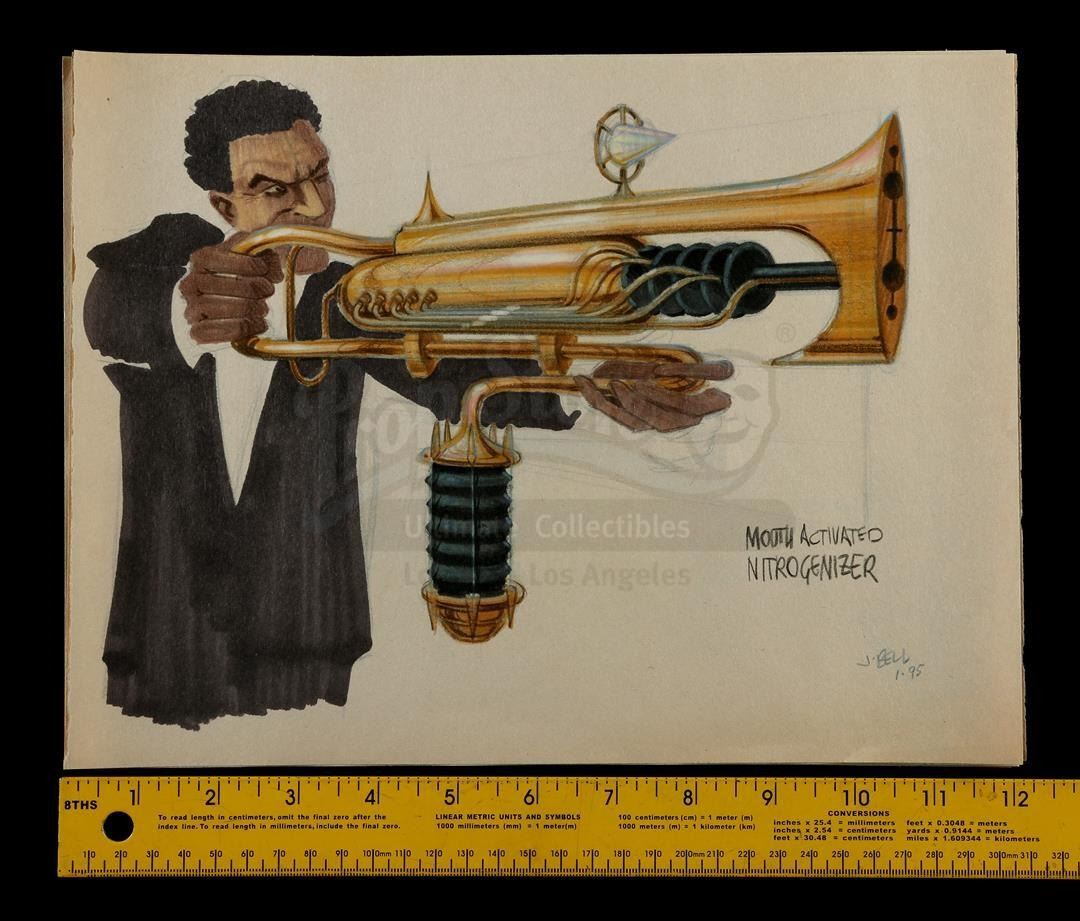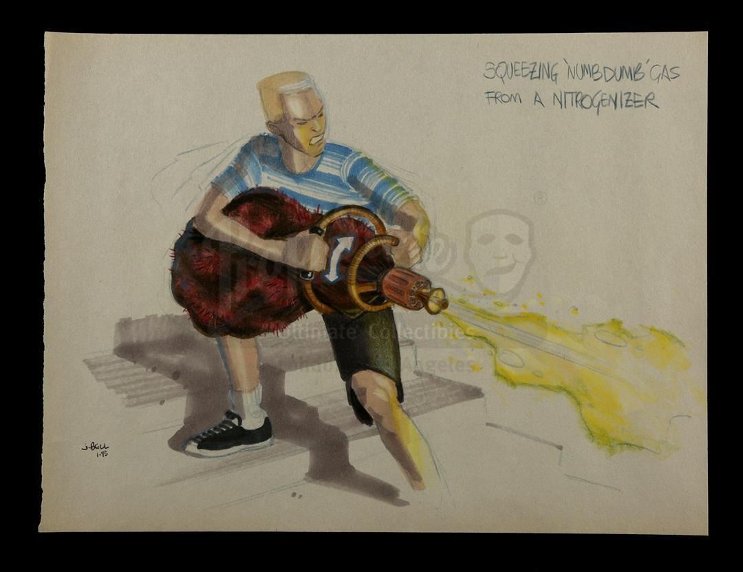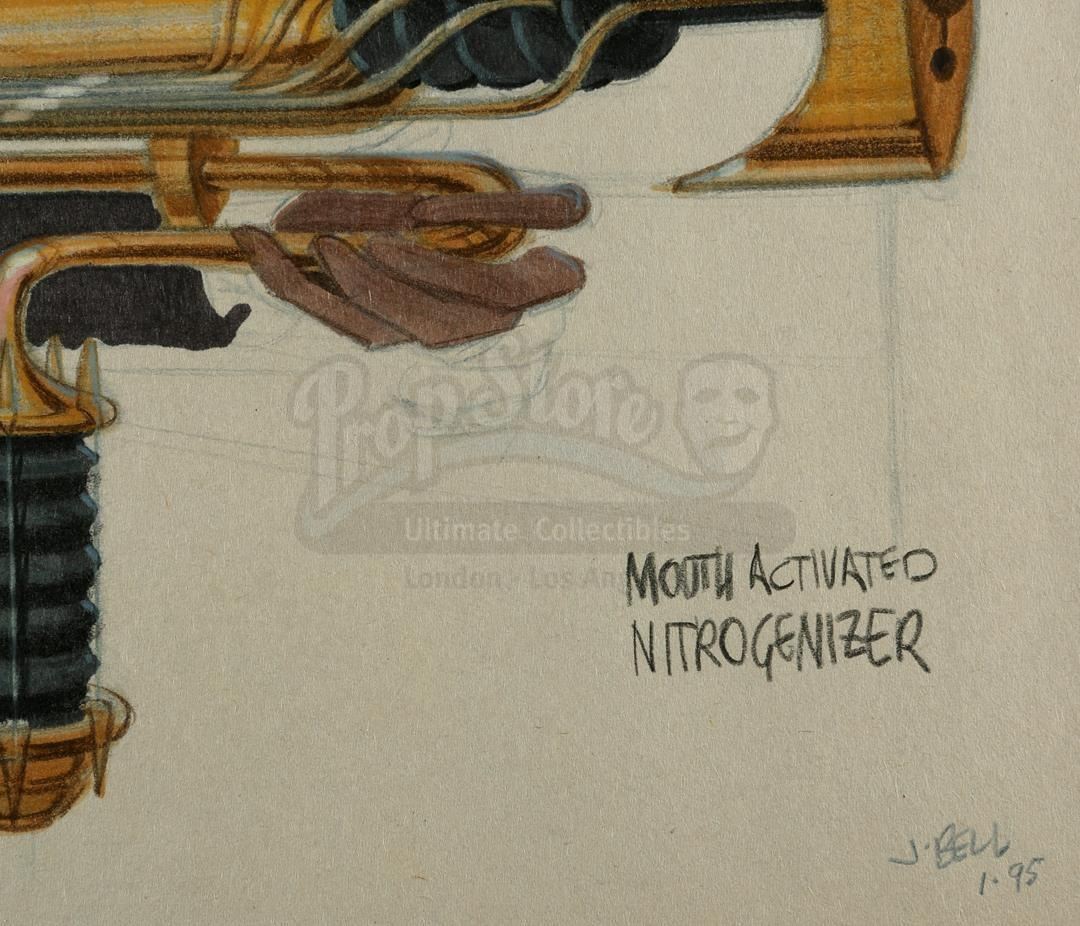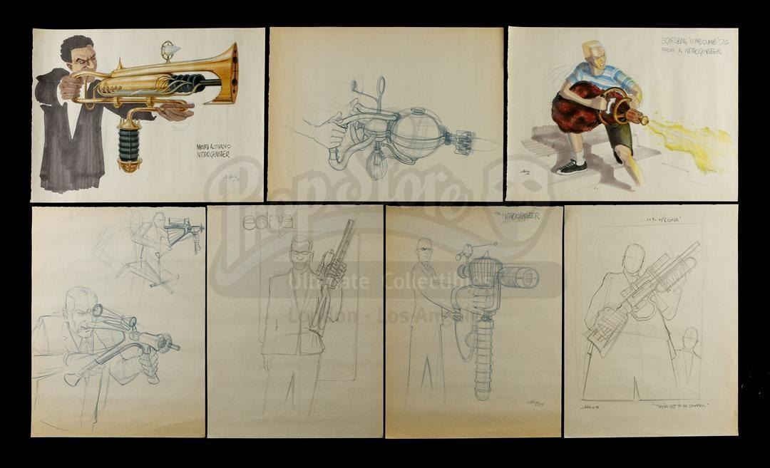 This lot consists of seven concept illustrations by John Bell, one of the early concept designers who helped develop the film's signature retro style, four of which are signed "J. Bell" and dated "94" or "95", for weapons such as the "Mouth Activated Nitrogenizer", "NumbDumb Gas", and "Edna". The set is rendered in mixed media on brown illustration paper, and remains in excellent overall condition with minor edge wear throughout. Dimensions (each): 23 cm x 30.5 cm (9" x 12")