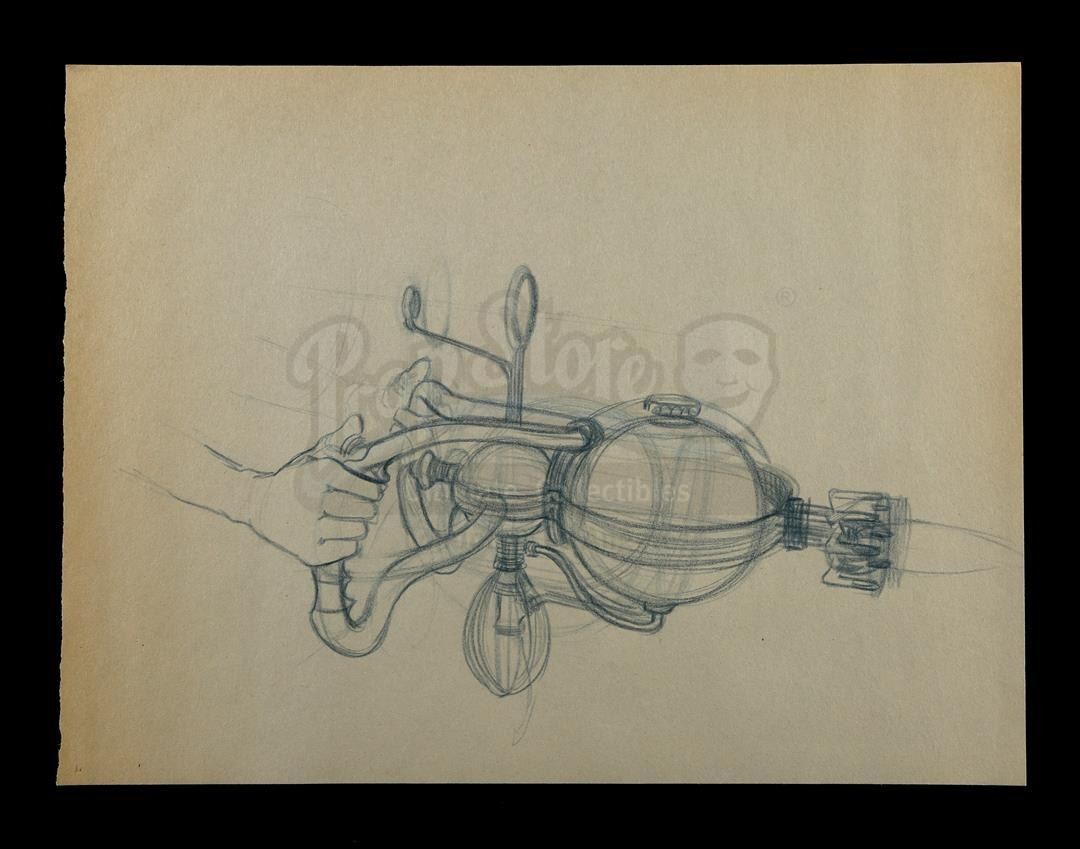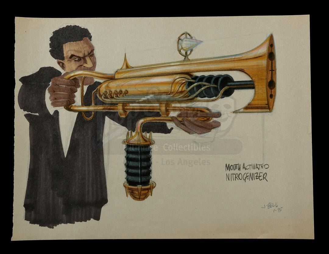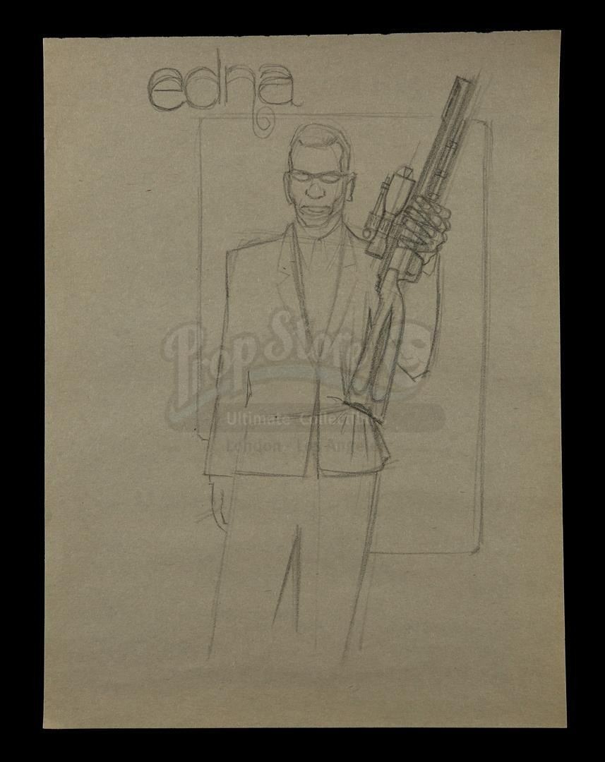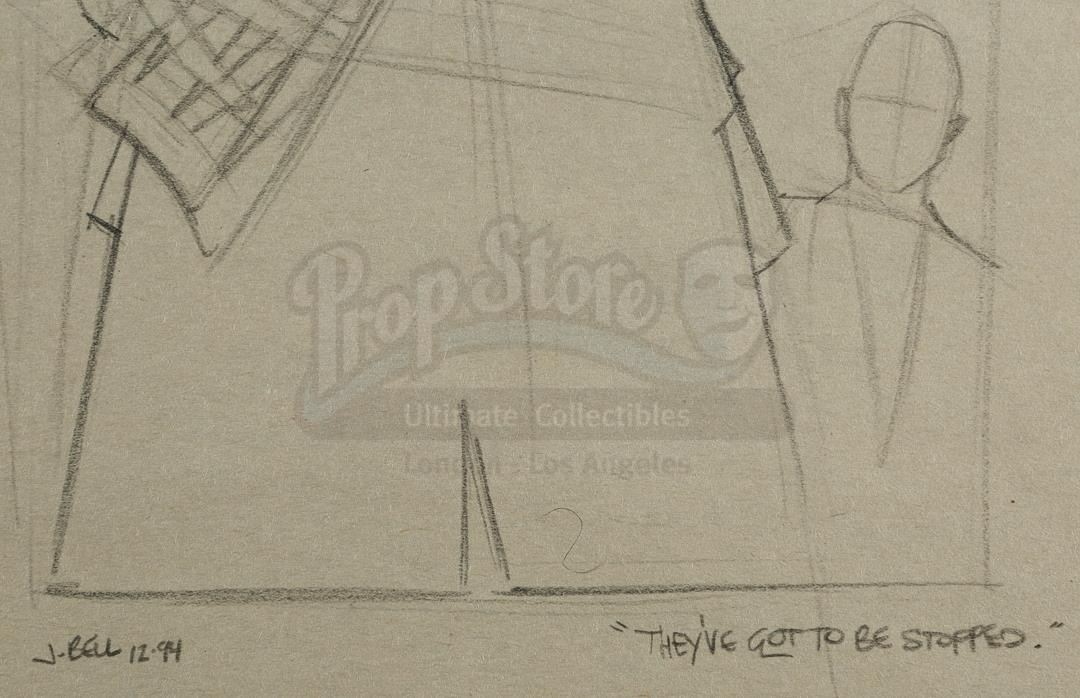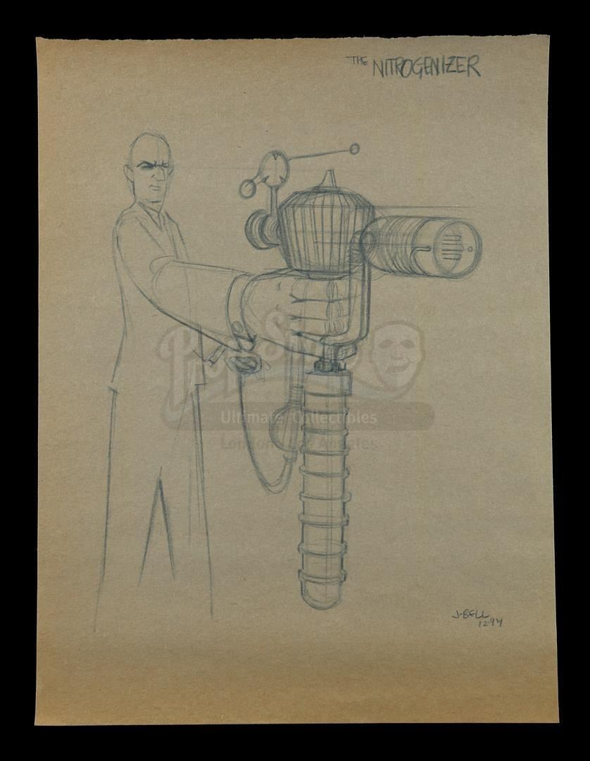 This lot consists of seven concept illustrations by John Bell, one of the early concept designers who helped develop the film's signature retro style, four of which are signed "J. Bell" and dated "94" or "95", for weapons such as the "Mouth Activated Nitrogenizer", "NumbDumb Gas", and "Edna". The set is rendered in mixed media on brown illustration paper, and remains in excellent overall condition with minor edge wear throughout. Dimensions (each): 23 cm x 30.5 cm (9" x 12")