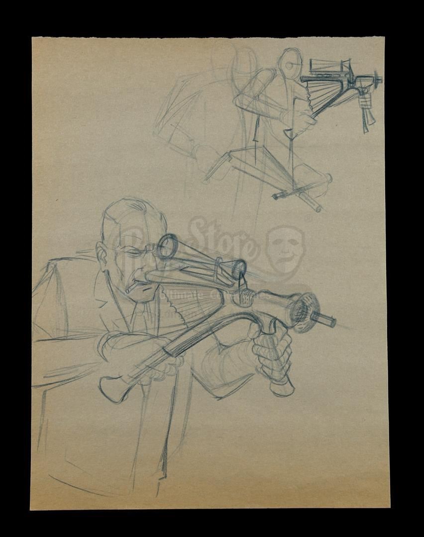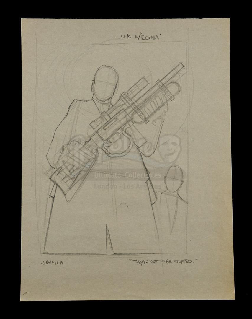 Seven hand-drawn John Bell weapon concept illustrations from the production of Barry Sonnenfeld's sci-fi comedy Men in Black. K (Tommy Lee Jones) and Agent J (Will Smith) wielded a variety of high-tech weapons as agents for the Men in Black.