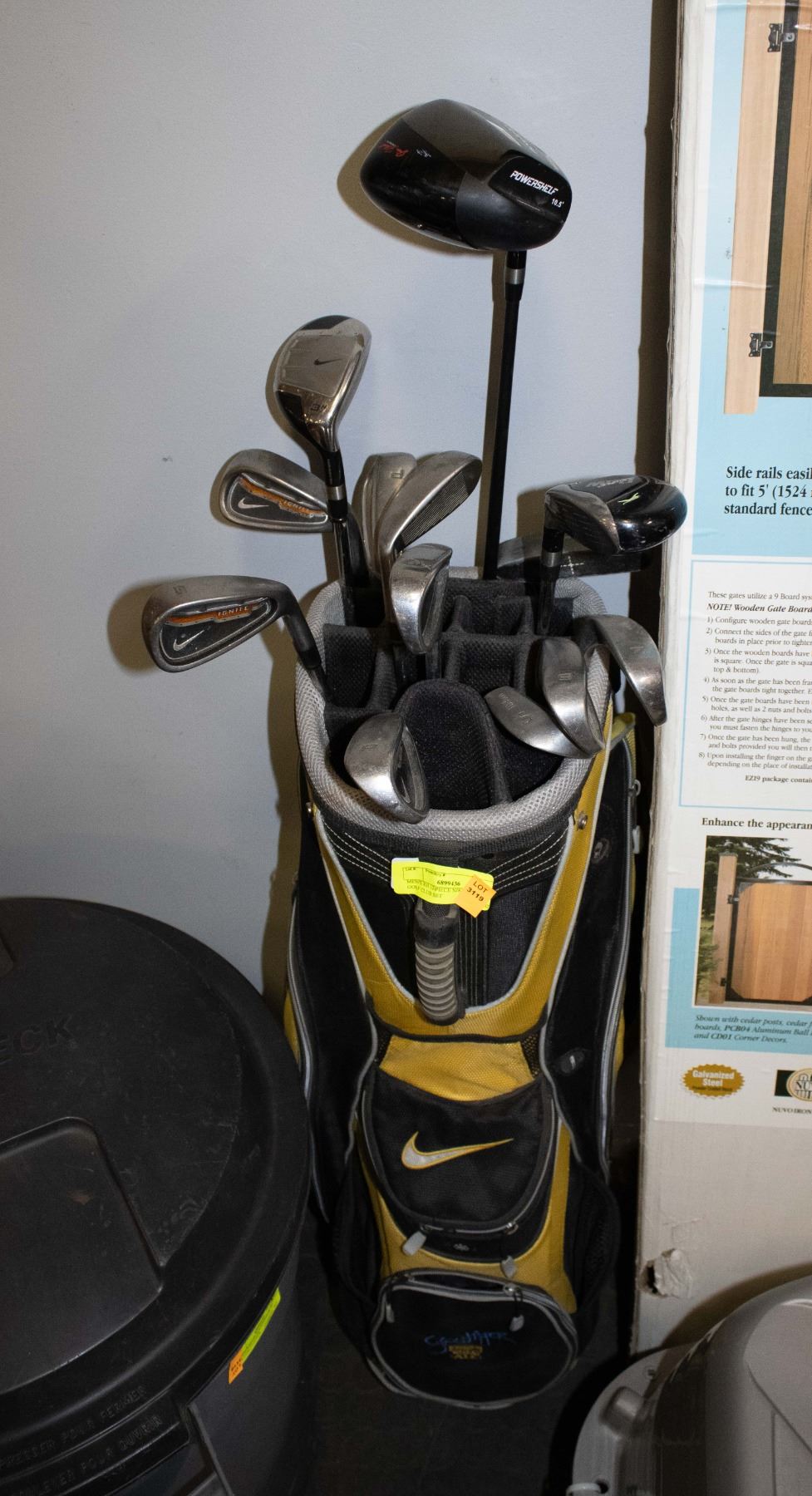 WITH BLACK AND GOLD NIKE BAG - SET INCLUDES: NIKE PW - UP TO 4 IRON WITH IGNITE 3 IRON HYBRID, SLAZENGER PAW, FAIRWAY 4 WOOD, TIGER SHARK 10.5o OVERSIZE DRIVER, WILSON PRO SPIN SANDWEDGE AND PUTTER - BAG HAS MULTIPLE LARGE COMPARTMENTS, SHOULDER STRA **ALL ITEMS MUST BE REMOVED BY 5PM SATURDAY, APRIL 5TH 2025. ALL REMAINING ITEMS WILL BE SUBJECT TO A $6.00 PER DAY STORAGE CHARGE. ANY ITEMS REMAINING AFTER MONDAY, APRIL 21ST 2025 WILL BE CONSIDERED FORFEITED. NO REFUNDS WILL BE ISSUED FOR FORFEITED ITEMS. TO SCHEDULE A PICK UP APPOINTMENT CLICK HERE