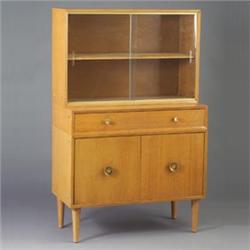 MENGEL MODULE blonde mahogany veneer buffet with single drawer over two doors with tapering dowel legs, also including hutched top with two glass doors and glass shelf. Additional detachable base with 3" dowel legs (not shown). Mengel Module label. 58" x 36" x 18" $800 - 1,200