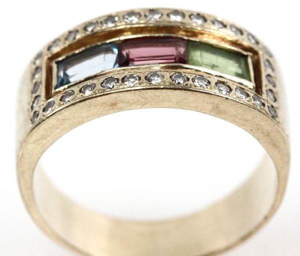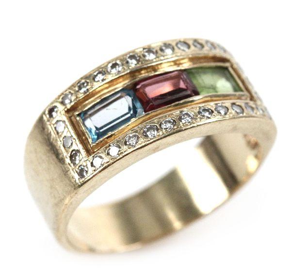 Ring is set with (32) 0.01ct round cut flush set diamonds, an approx. 0.32ct emerald cut blue topaz, an approx. 0.28ct emerald cut amethyst, and an approx. 0.35ct emerald cut green tourmaline. Size: 11.5 Weight: 11.0 g Condition: Very good, with some wear